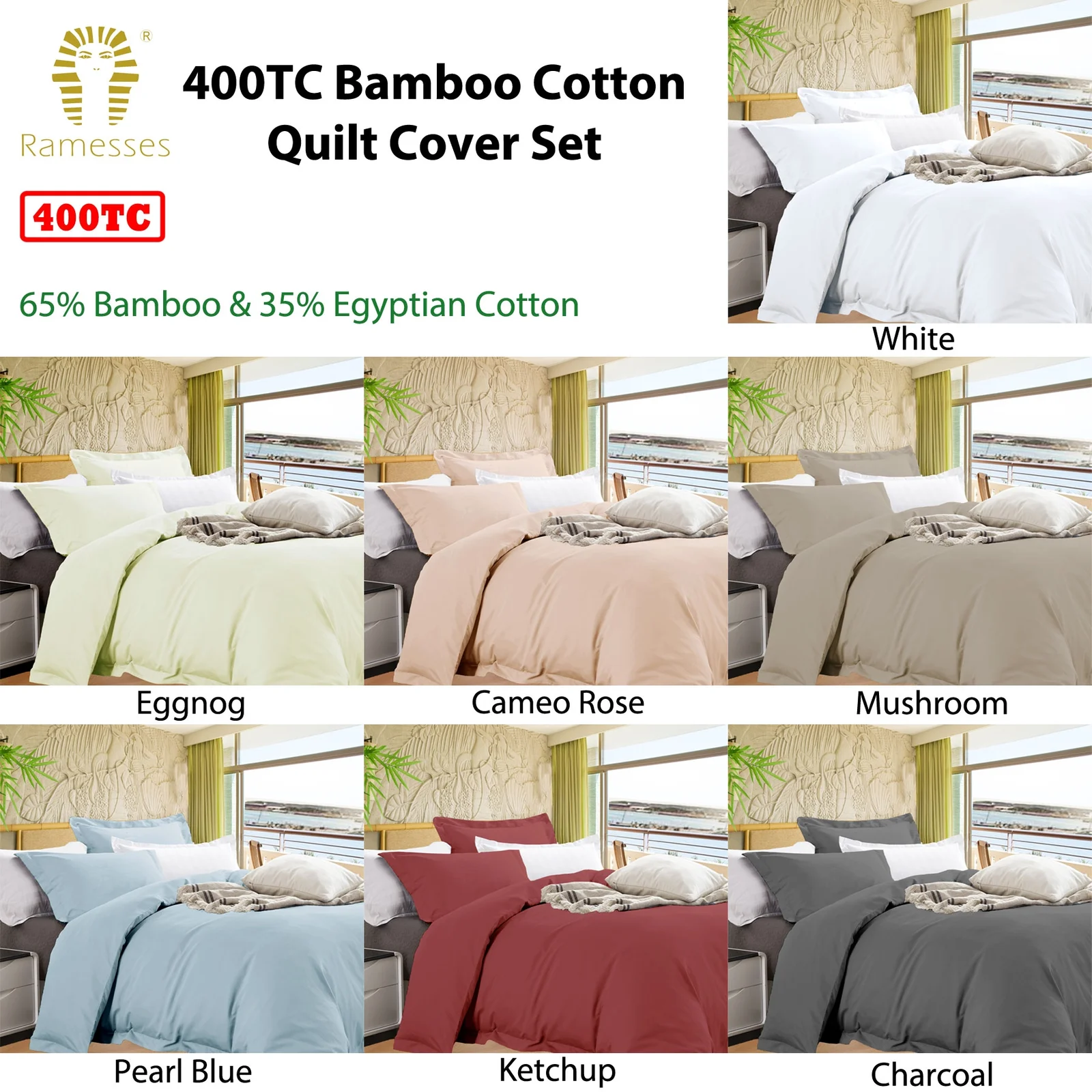 Make your bedroom setting stand out with this high quality 400TC Bamboo Cotton Quilt Cover Set by Ramesses. It features solid colour design in neutral tones that will suit your very own personal style. It is made from Bamboo and Egyptian Cotton fabric that cool in summer, warm in winter for a harmonious and relaxing night's sleep. Available in seven colours.