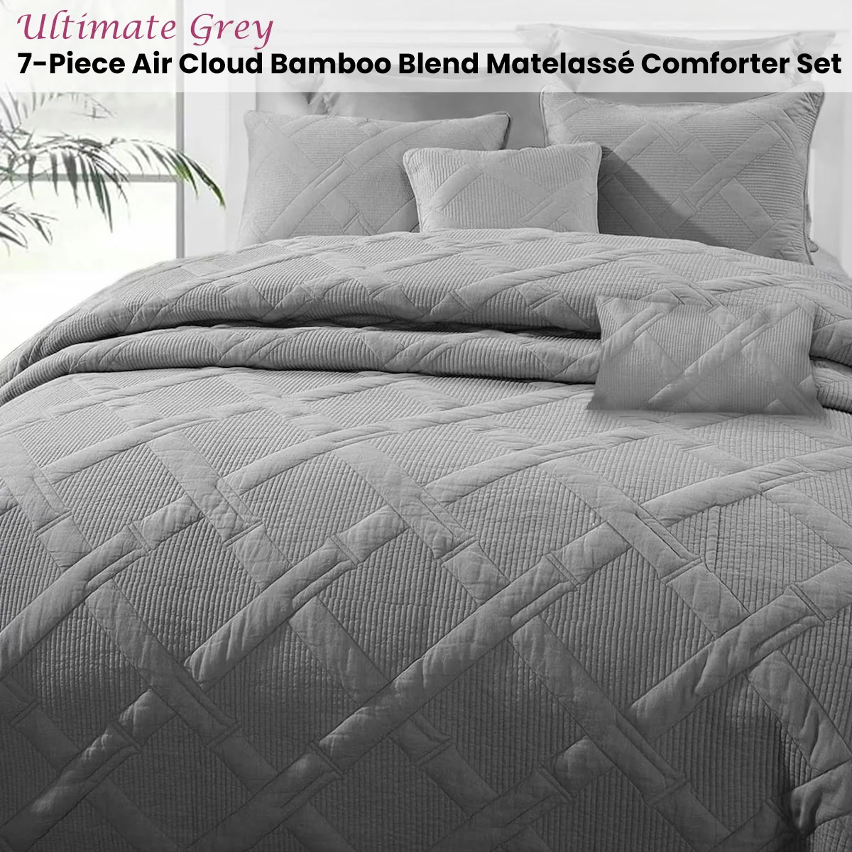 Spruce up your sleeping space in style with this Ultimate Grey 7-Piece Air Cloud Bamboo Blend Matelasse Comforter Set by Ramesses. A matelasse technique creating variegated stripes in raised horizontal panels, elegantly finished with tailored boarders for some intricate texture and style. This bedding set comes complete with a comforter, two European pillowcases, two standard pillowcases, a cushion and a breakfast pillow. Crafted with bamboo blend material, you'll be sleeping in breathable and germ-free comfort all night long. This bedding collection comes in a variety of colors, instantly transforming your bedroom into a cozy cover you'll love relaxing in. Simply pair this bedding collection with sheets your choice to bring a refreshing update to your sleeping nook.