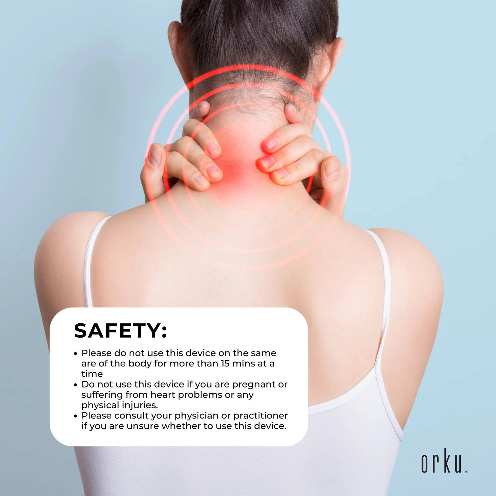 - Please do not use this device on the same are of the body for more than 15 mins at a time
