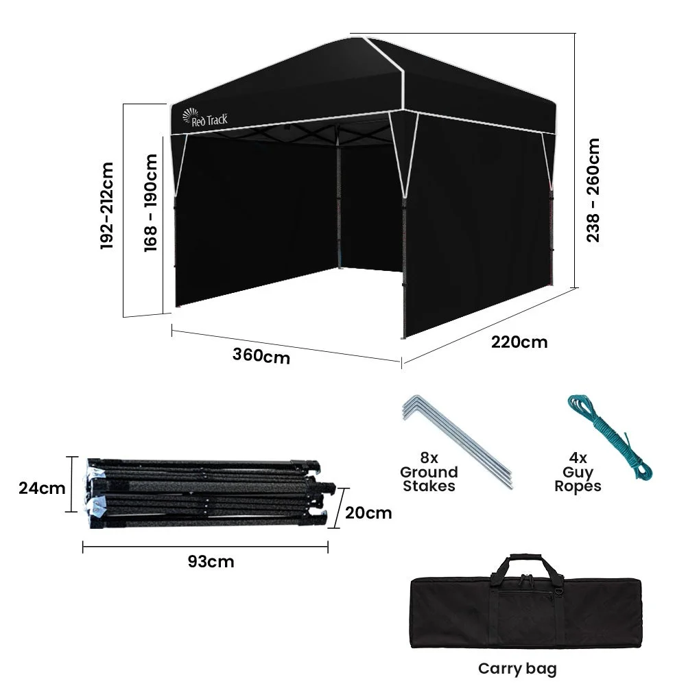 The Red Track 2.2x3.6m Gazebo (with 3 walls included) stands out with the smallest folded size on the market—just 93cm long! This ultra-compact 13kg design makes it incredibly easy for one person to carry, transport, and store, offering unmatched convenience compared to bulkier alternatives. Whether you're short on space or always on the move, this gazebo’s design ensures portability without compromise.