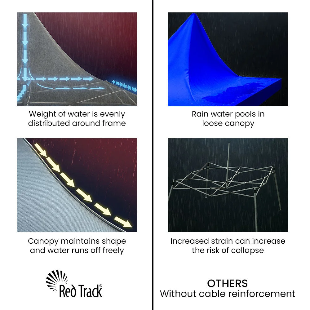 At the heart of the design is Red Track's patented steel-cable reinforced canopy structure, which keeps the roof tight, prevents water from pooling, and adds exceptional wind resilience. Combined with oversized truss bars and square-tube steel legs, this gazebo offers rigidity you can rely on.