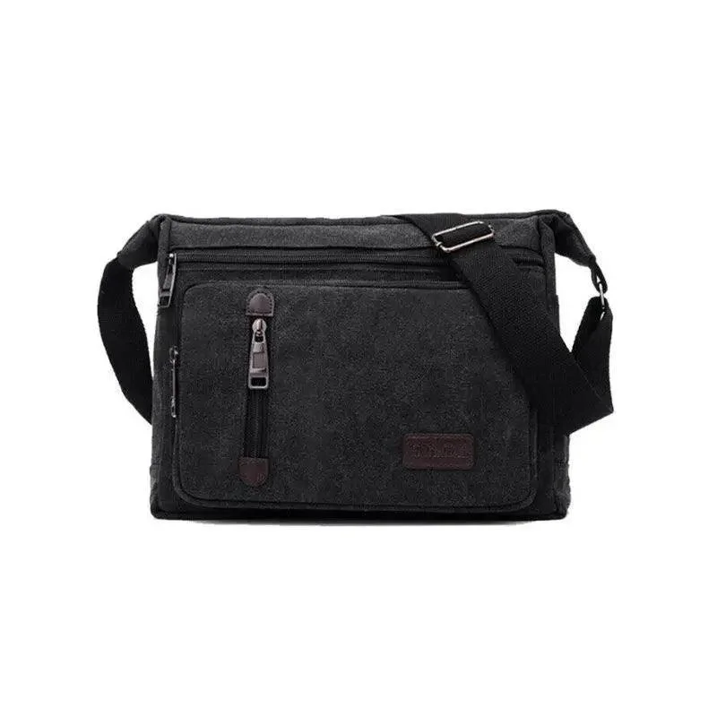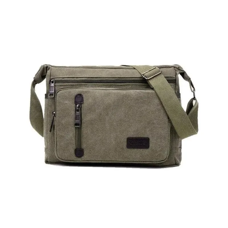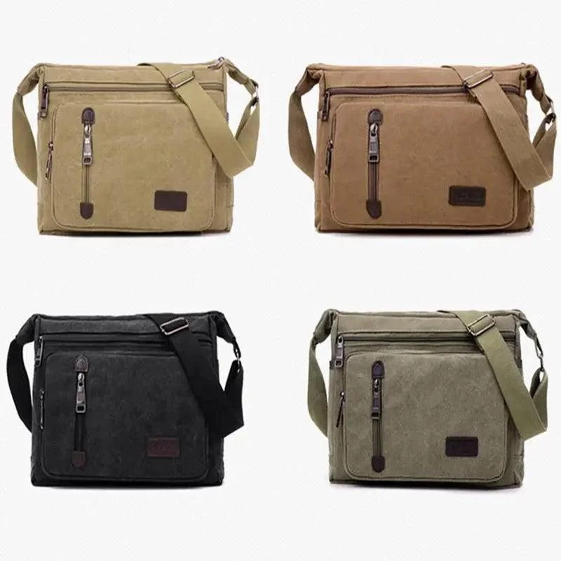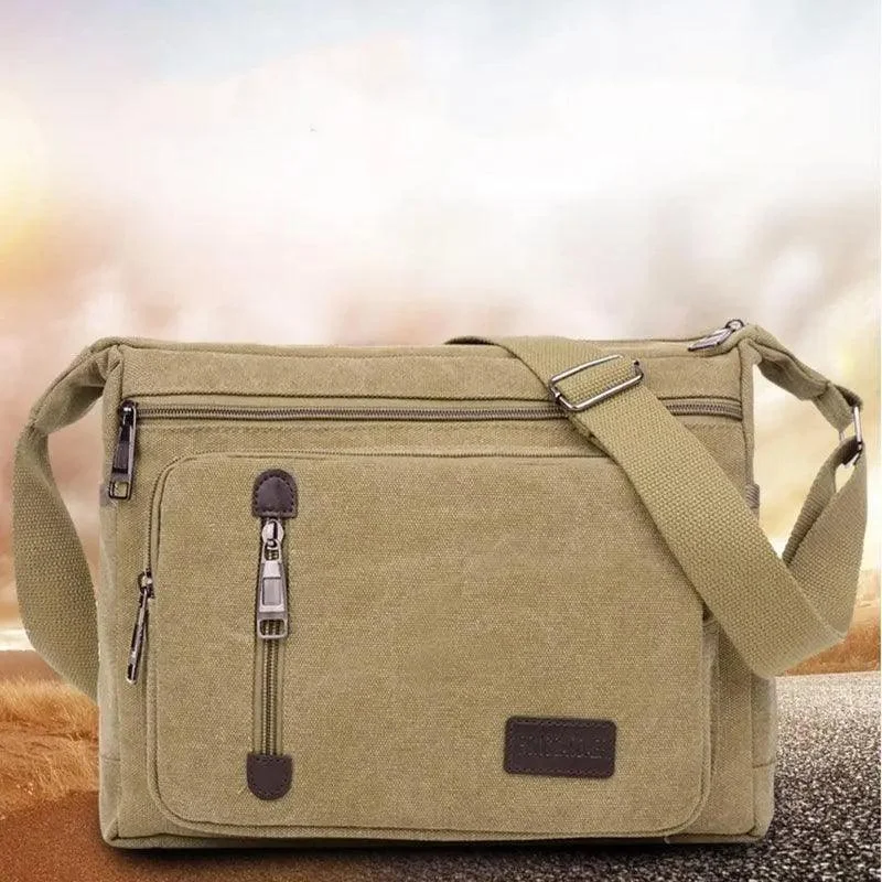 Vintage men’s canvas messenger bag with spacious main compartment and multiple zippers