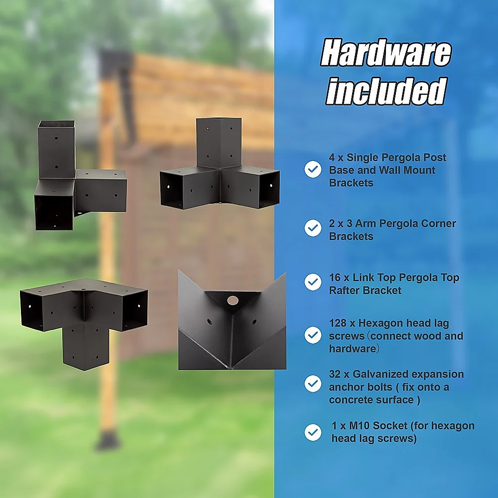 Each kit comes complete with all the hardware you need for installation, including screws and brackets, ensuring a hassle-free setup process. With everything included, you can have your new pergola up and running in no time, ready to enjoy outdoor gatherings and relaxation. (*Lumber not included.)