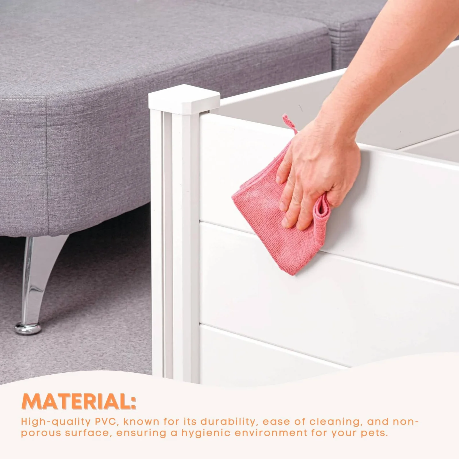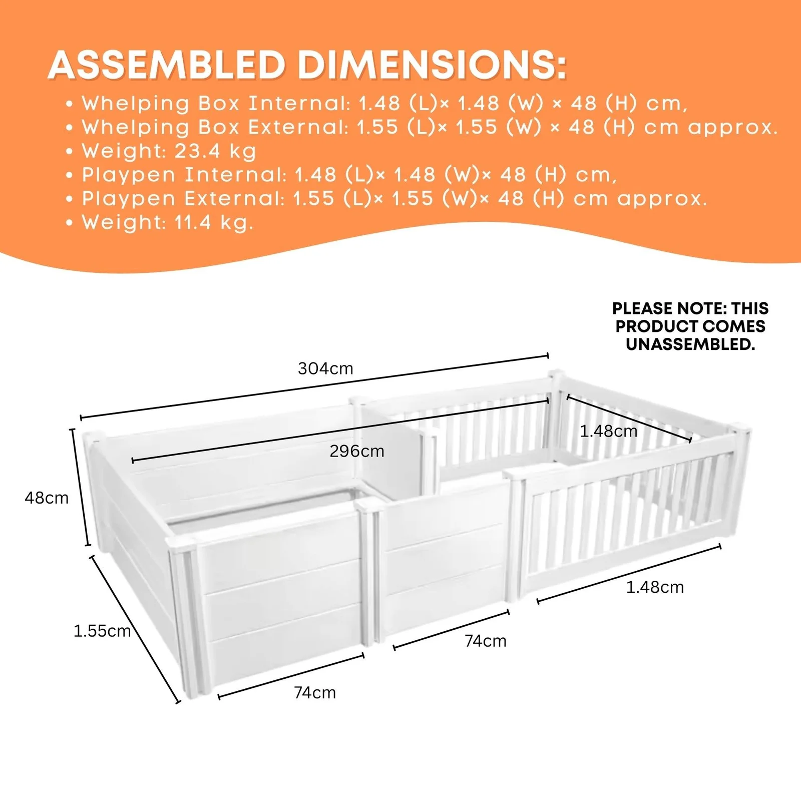 Rooster Farms PVC Whelping Box and Playpen Kit provides a safe, hygienic, and comfortable space for mothers and puppies. Made from non-porous PVC, it is easy to clean, UV-stable, and designed for simple assembly and storage. Anti-crush rails help protect puppies and removable entry slats allow controlled access. A connected playpen offers additional space for supervised movement and early development.