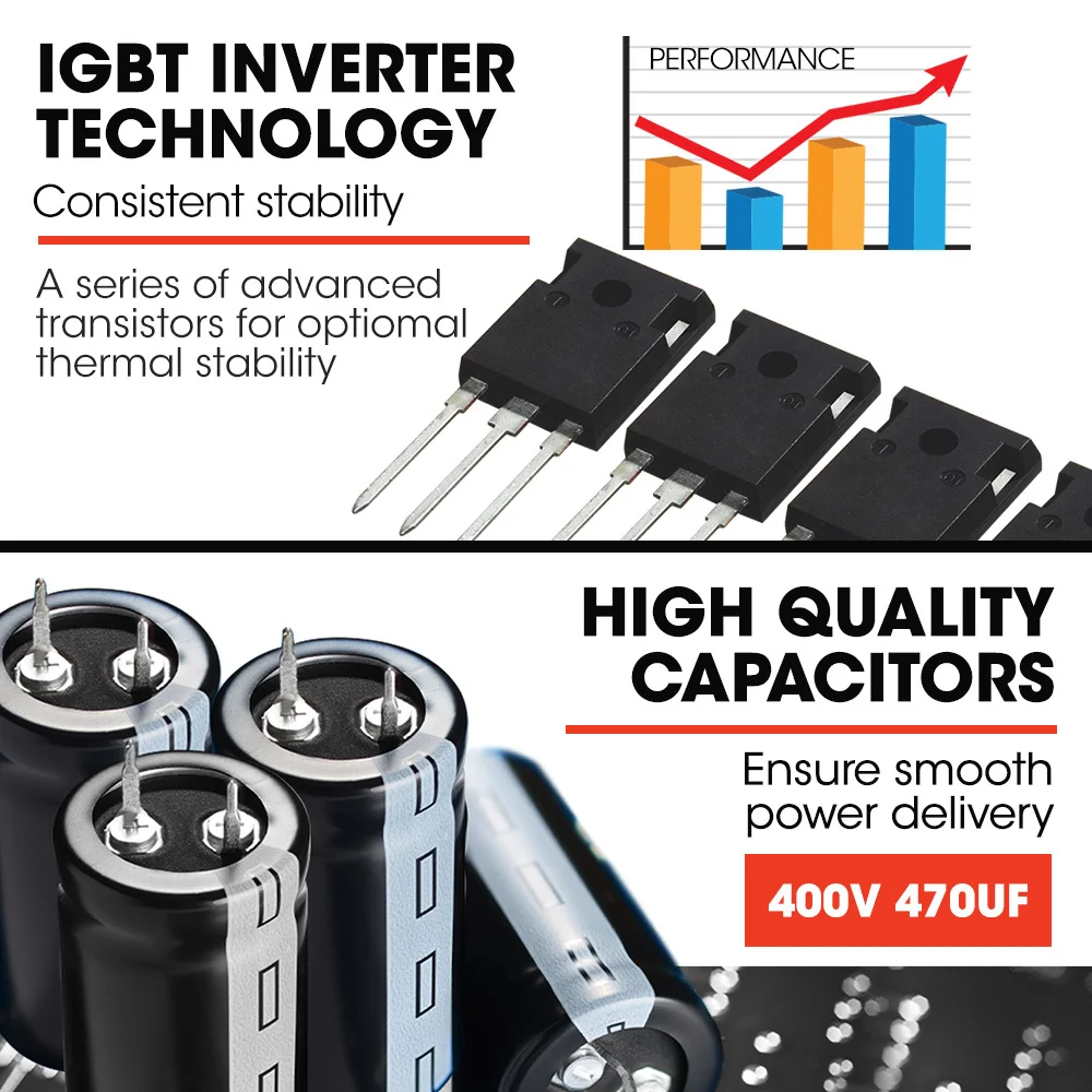 The transistor bridge, IGBT, technology provides continuous current rectification. This allows for improved efficiency with power conversion exceeding 85%. The entire range of Rossi welders feature IGBT Inverter technology meaning they are 30% lighter, more compact and easier to use than ever.