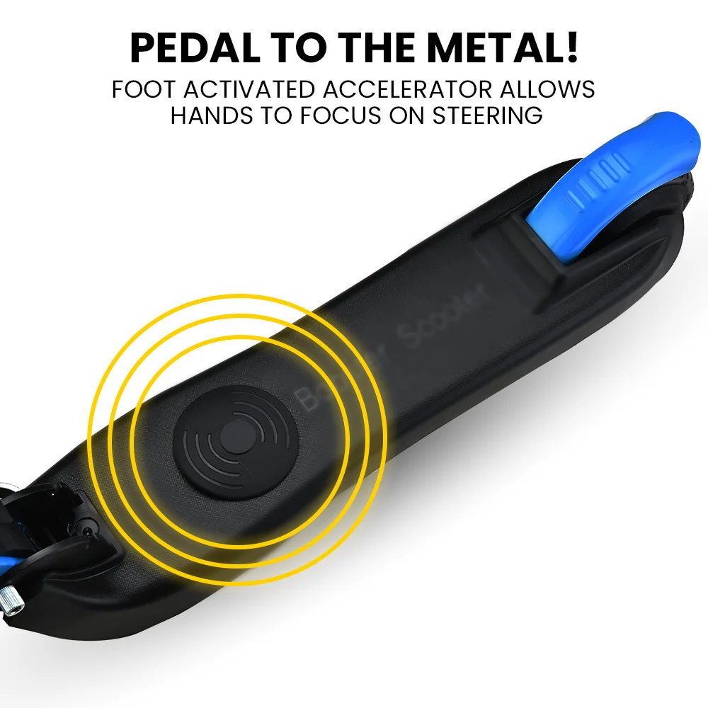 After pushing off, the foot activated accelerator button provides the power while keeping hands fully focussed on steering duties, while slowing is done by a foot press of the rear fender brake.