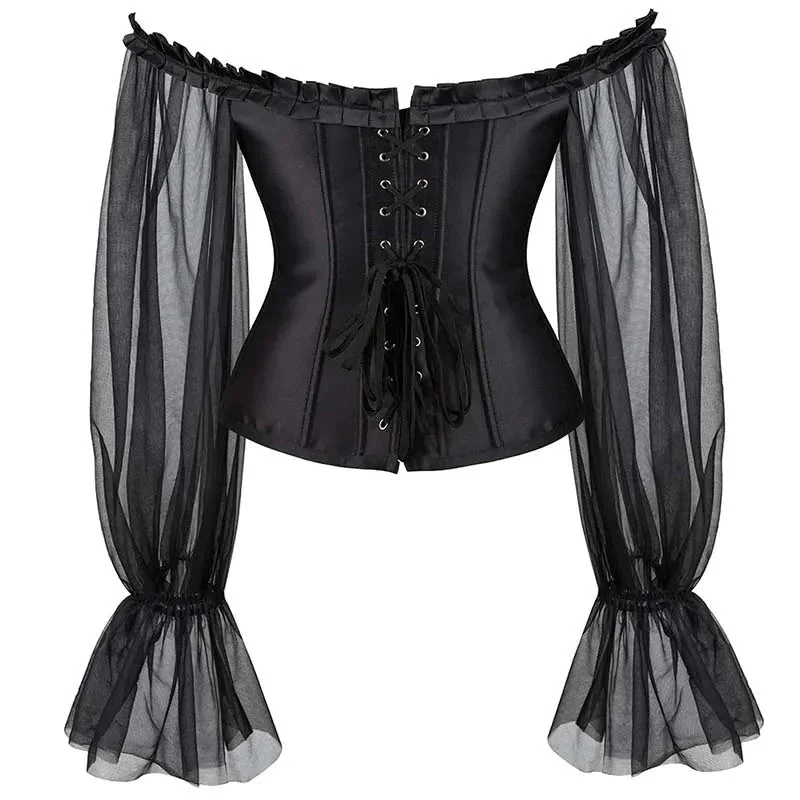 Brown Steampunk Corset With Front Busk Closure Floral Lace And Puff Sleeves - Dark Blue - L