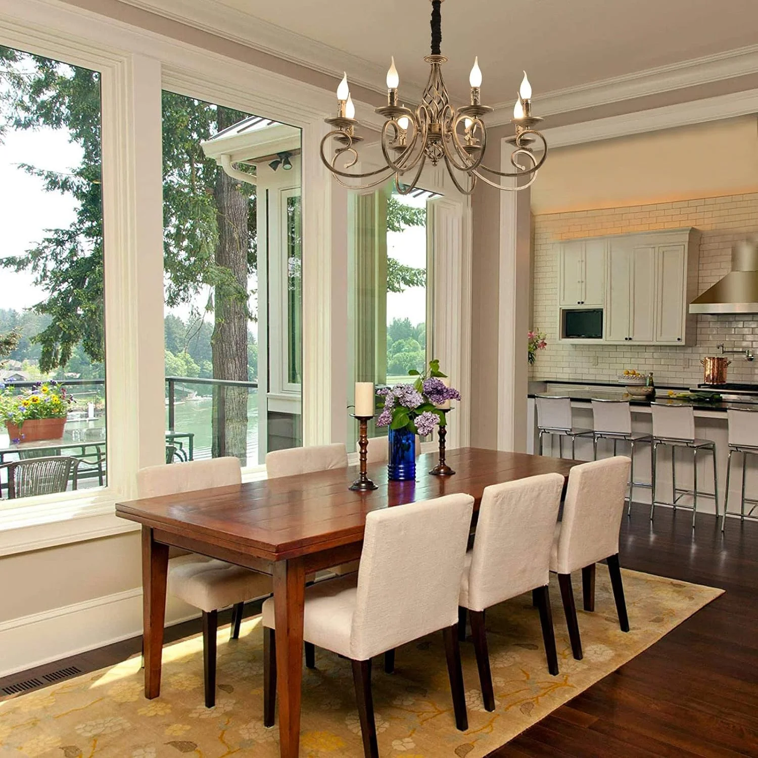 - This vintage chandelier is the perfect addition to any farmhouse, barn, or country-style home. Crafted with a durable metal frame and 8 simply curved iron arms, each holding a candle-shaped bulb stem with a dish cup, it adds a rustic and mid-century charm to any room. Ideal for kitchen islands, dining rooms, living rooms, bedrooms, little houses, and hallways, this chandelier will complete the look of your space.