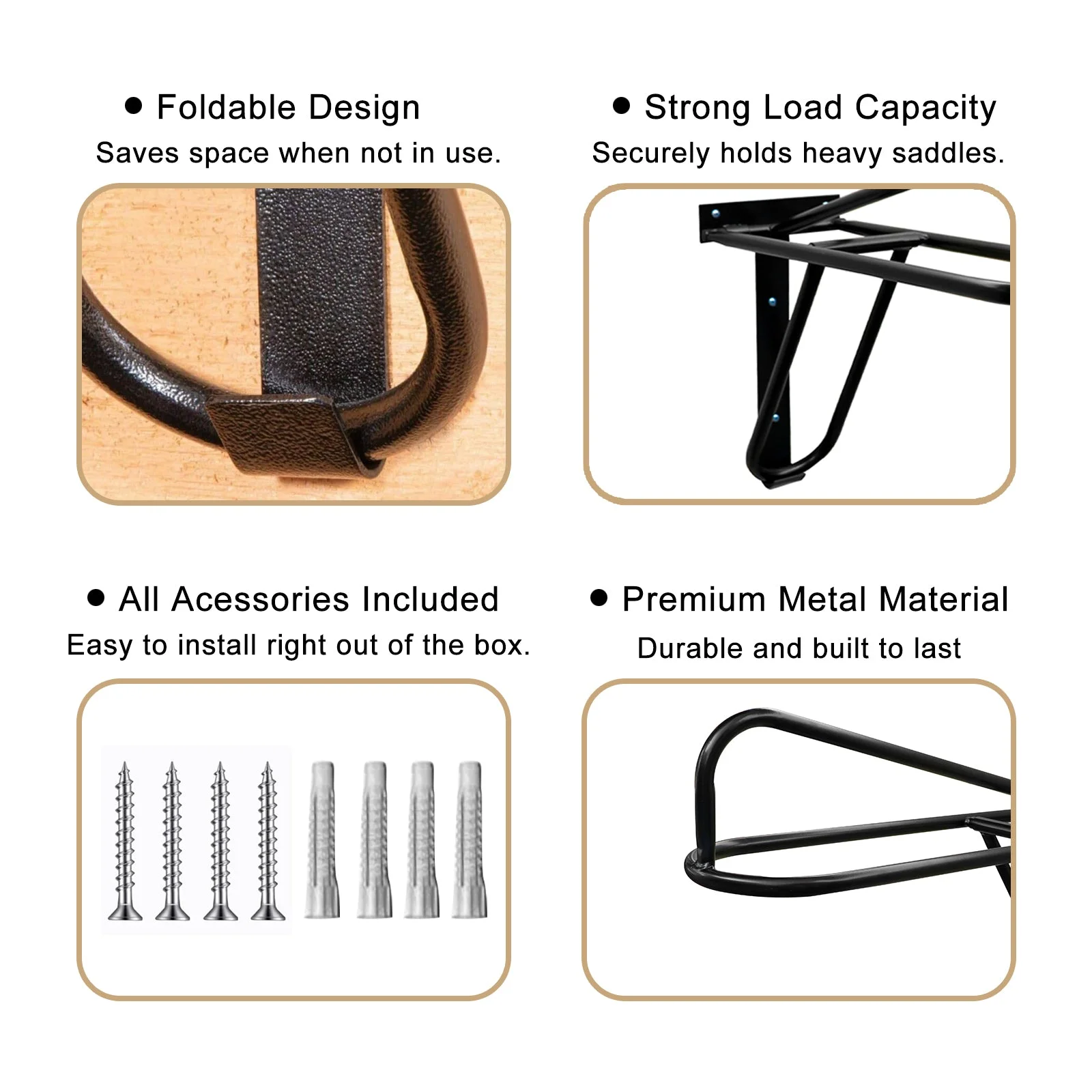 This foldable wall-mounted rack holds both Western and English saddles securely, saving space when not in use. Made from rust-resistant steel with a matte black finish, it��s easy to install on timber, brick, stone, or concrete walls. Also great for hanging coats, bags, or tools��perfect for any stable or garage.