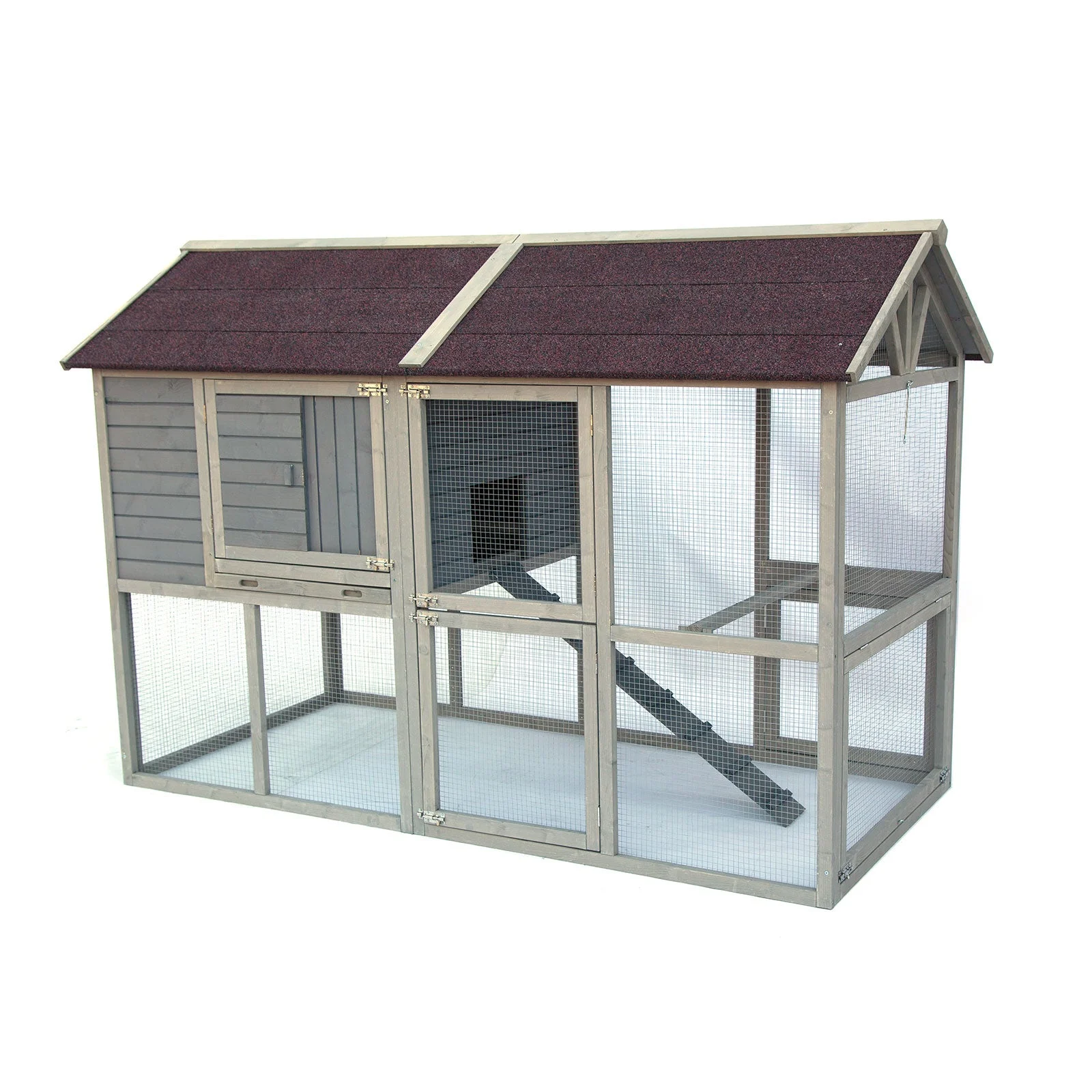 ? ? ?NEW DESIGN - Constructed of solid wood with durable wire and heavy duty latches, Open and hooked side door, 2-section walk in doors, sliding out metal covered tray for easy cleaning, ventilated windows