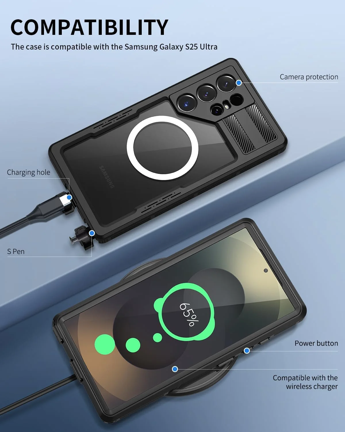• ? [IP68 Waterproof] This Samsung Galaxy S25 Ultra Case is IP68 Waterproof Certified, submerged to 10ft/3 m for 1 hour,and is protected from dust,dirt,water,snow and rain. The whole body protection design allows you to take photos/videos underwater. In addition, the washable design ensures its easy cleaning and keeps your phone and case always look like new, protect your phone from scratches and fading