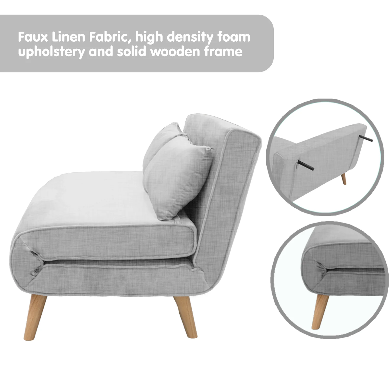 This adjustable Sarantino Sofa bed is composed of an easy to clean, durable and soft to touch linen inspired fabric, providing top-quality comfort with wooden legs and support while you sit. The sturdy solid wood frame 2-seater Sofa converts easily into a comfortable bed for you, your family and/or unexpected guests.