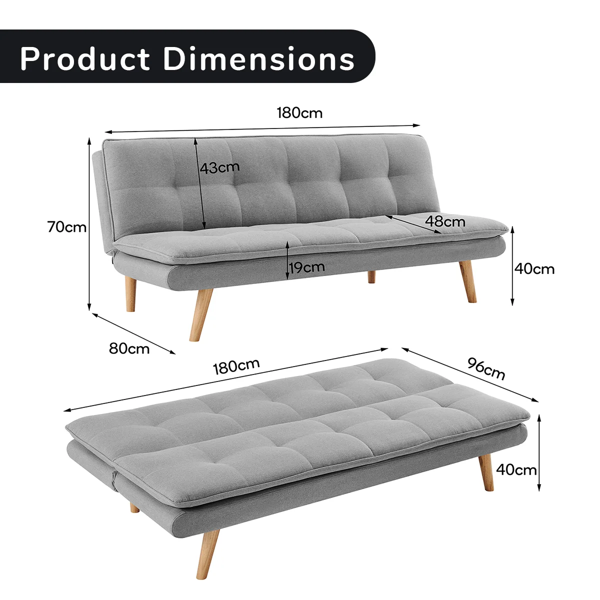 - Sofa: 180cm x 96cm x 40cm