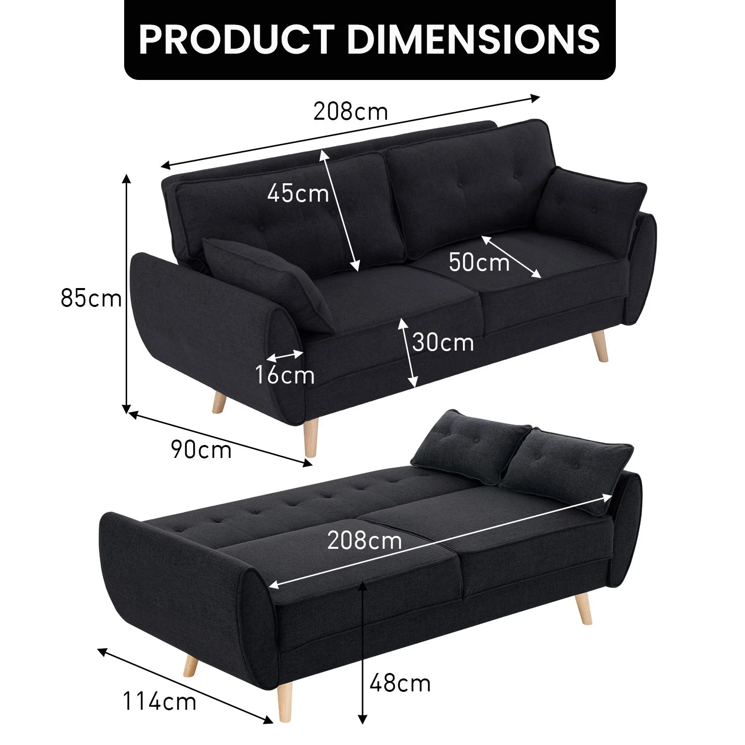 - Sofa Bed: 208cm (w) x 114cm (d) x 48cm (h)
