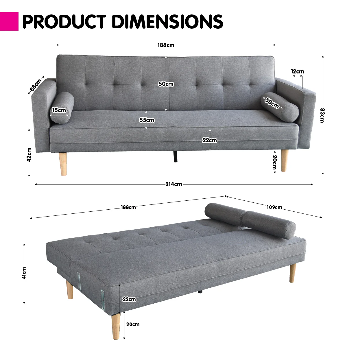 Measuring (w) 214cm x (d) 88cm x (h) 83cm, this sofa bed features wooden frame as well as pillows and comfortable seating to provide a sofa that's truly comfortable to sink back into and relax.