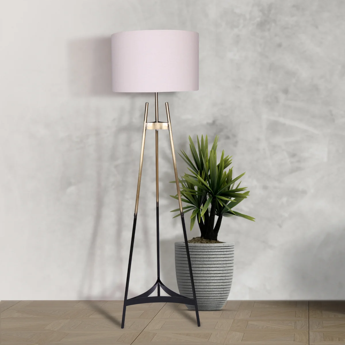 This elegant tripod floor lamp matches many decor styles. It looks stunning with a range of interiors including art deco, mid-century modern and contemporary. Add a touch of elegance to your living room, bedroom or office with its neutral linen drum lamp shade that complements its gradient plated gold finish tripod legs. Its sophisticated style and relaxing shaded lighting make this tripod floor lamp a beautiful choice for your home.