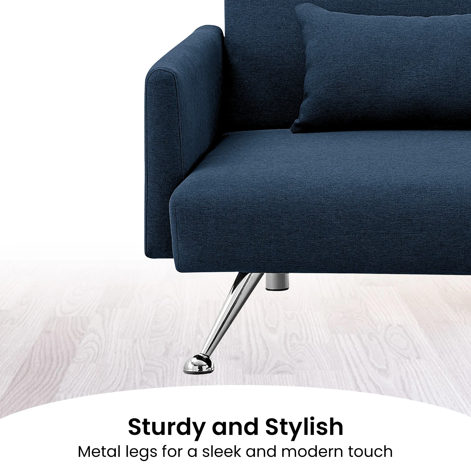 This couch is upholstered with soft, premium fabric for lasting style and durability. The slanted metal legs add a touch of luxury, while the solid color complements a range of throws, cushions, and other decors. Even better, the sofa comes with three pillows for optimum style and comfort!