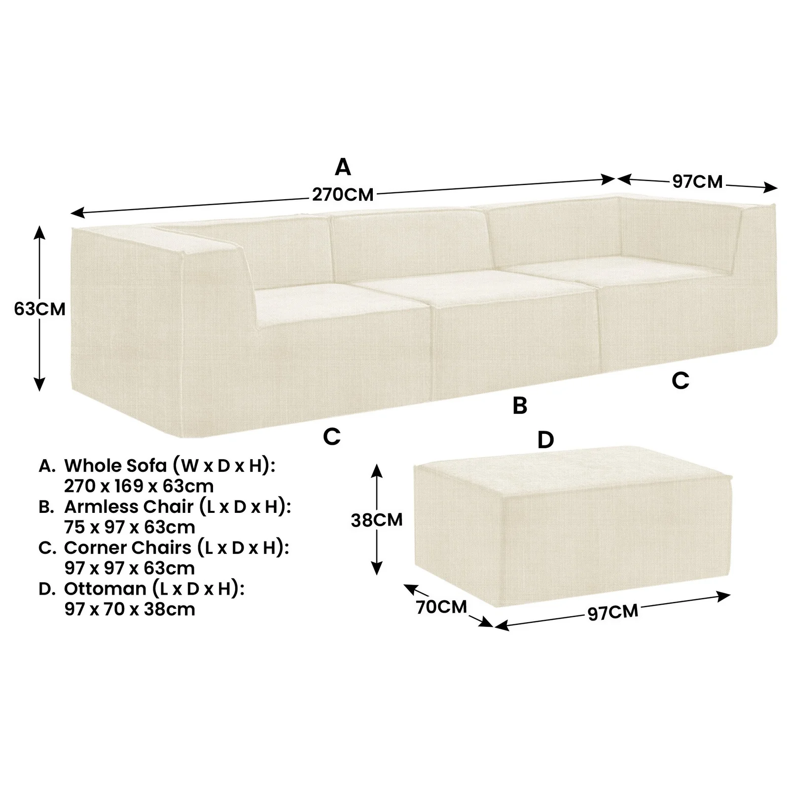 - Ottoman (L x D x H): 97 x 70 x 38cm