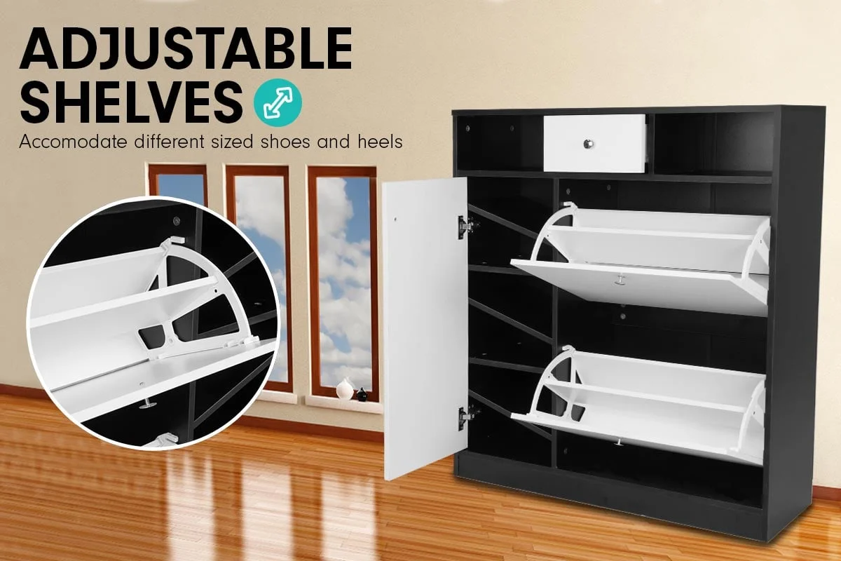 Shoe lovers will absolutely love this fabulous 16-pair shoe cabinet design. With 9 adjustable shelves to accommodate your storage needs, you can slide in different sized shoes and heels effortlessly.