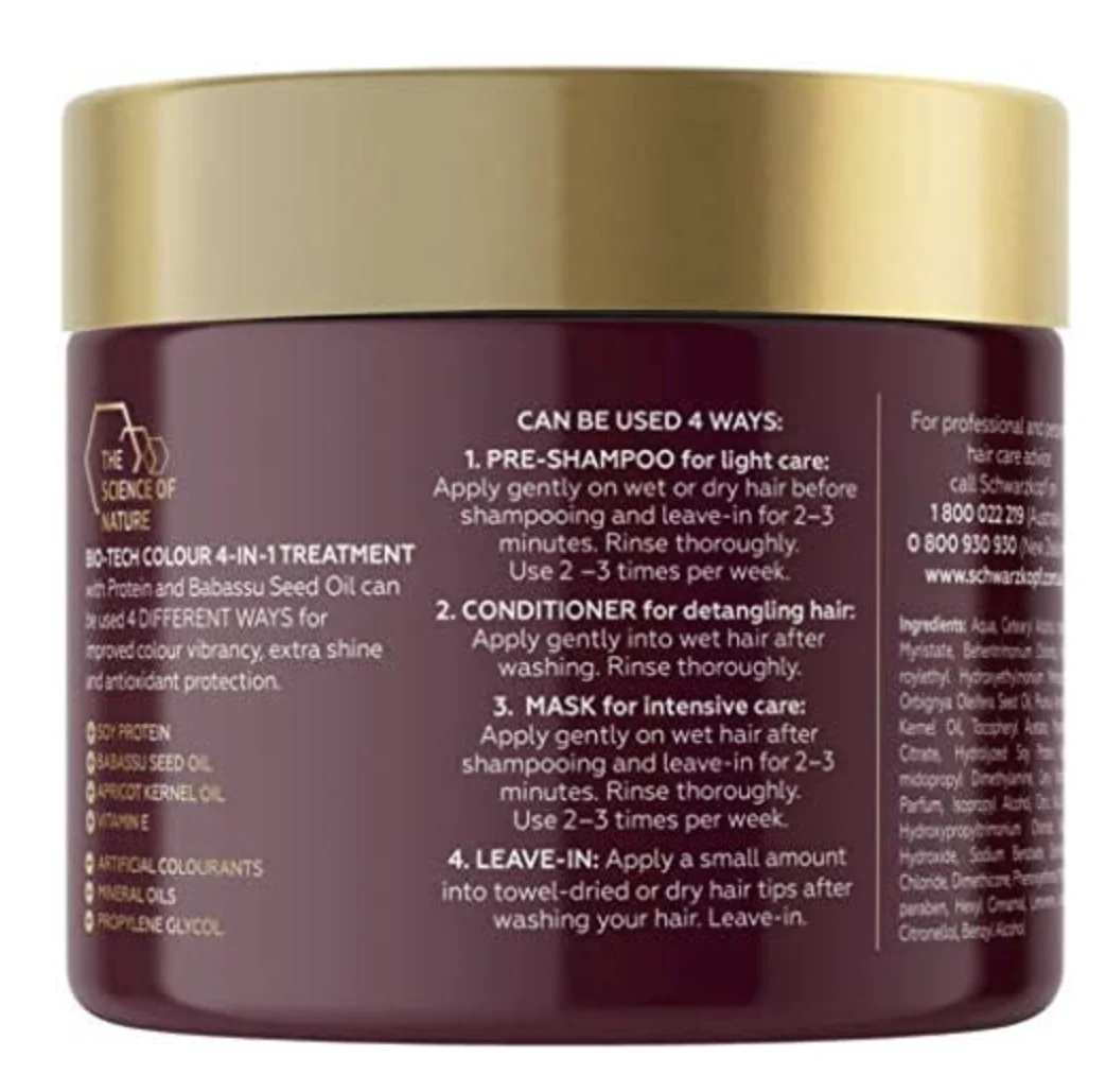 Schwarzkopf Extra Care Bio-Tech Colour 4-In-1 Treatment is a hair treatment that contains soy protein and babassu seed oil to provide special care for colored and highlighted hair by improving color vibrancy and providing extra shine and antioxidant protection. This treatment can be used in 4 ways: As a pre-shampoo for light care; as a conditioner for detangling; as a mask for intensive care; and as a leave-in treatment after towel-drying hair. Free from artificial colorants, mineral oil, and propylene glycol.