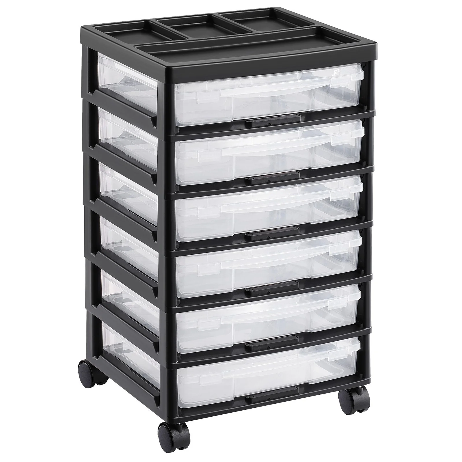 This scrapbook rolling storage cart includes six large 14 x 14-inch storage boxes, providing an efficient solution for categorizing and storing items. The organizer top features divided compartments for convenient organization and quick access to frequently used supplies. This well-designed system makes it an ideal choice for your storage needs