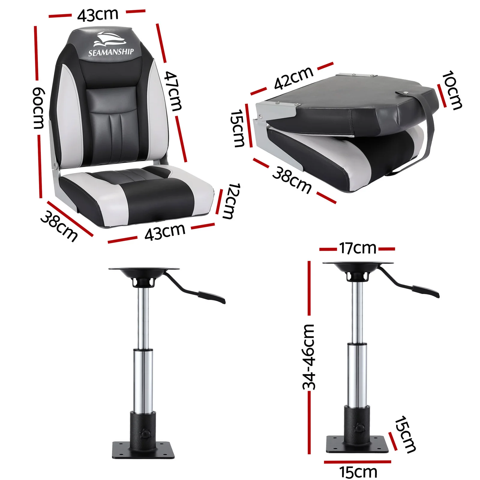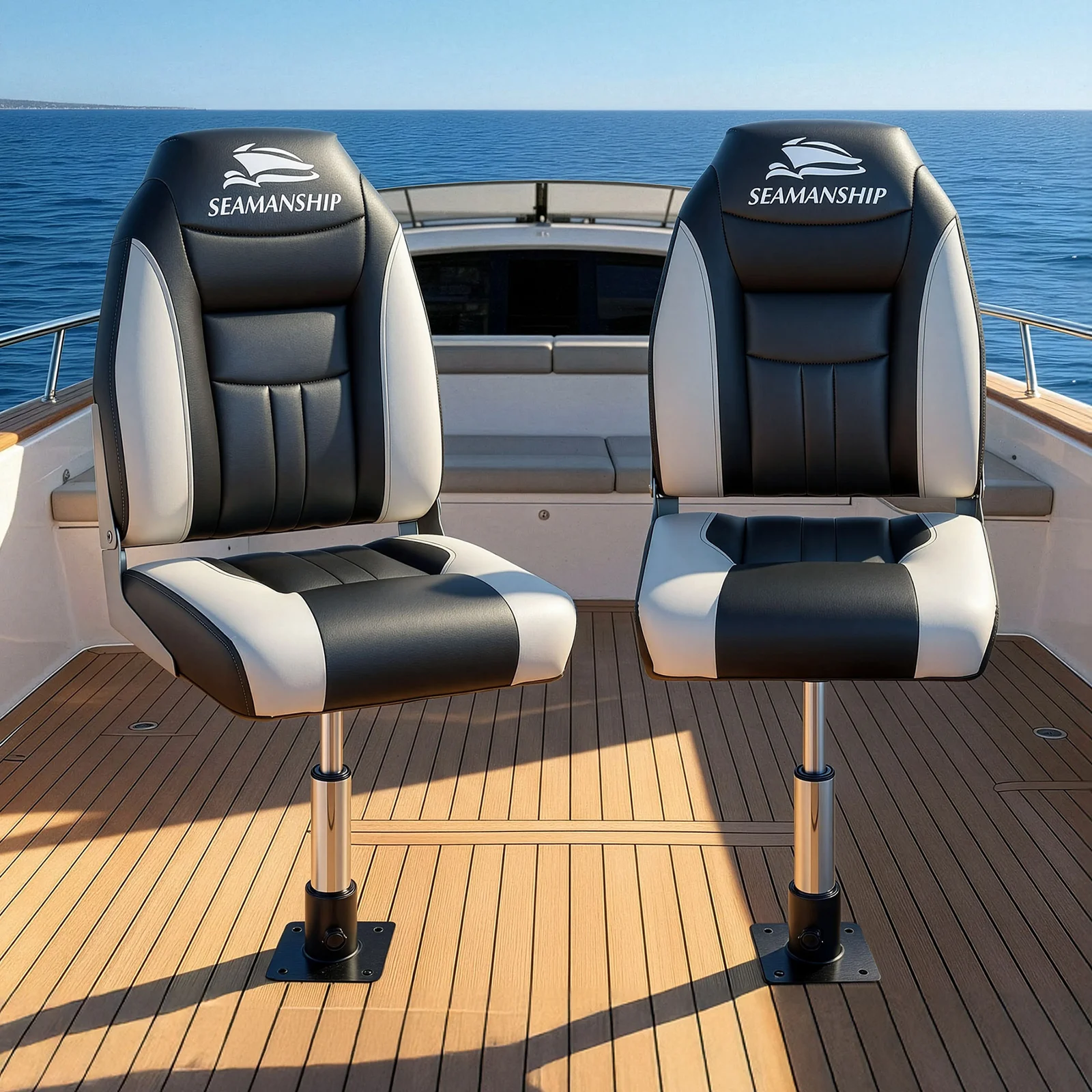 This 2-Pack Set includes two folding boat seats and two 34–46cm adjustable gas lift swivel pedestals—everything you need for professional-grade onboard seating. Enjoy your watery outing even more with our pair of Seamanship Boat Seats. Made of high quality premium plastic and UV-resistant PVC, these Boat Seats are made to perform in all weather conditions. The wind, the rain and the sun and even salt water does them no harm.