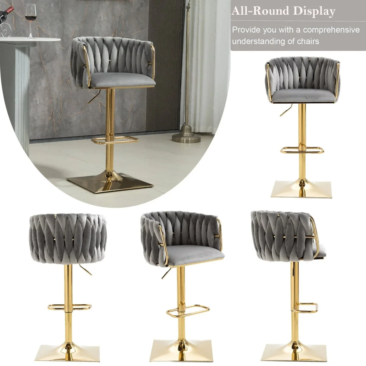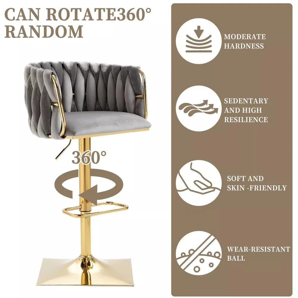 2x Height Grey Velvet Padded Golden Round Base Barstools Chairs