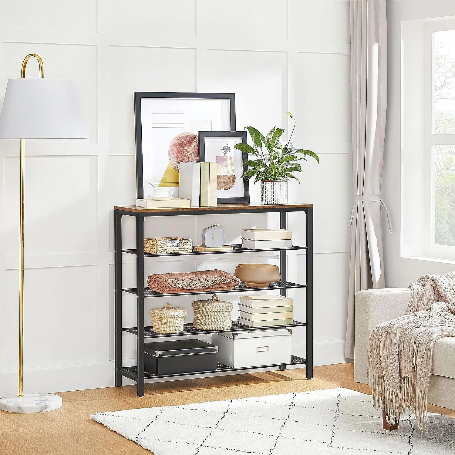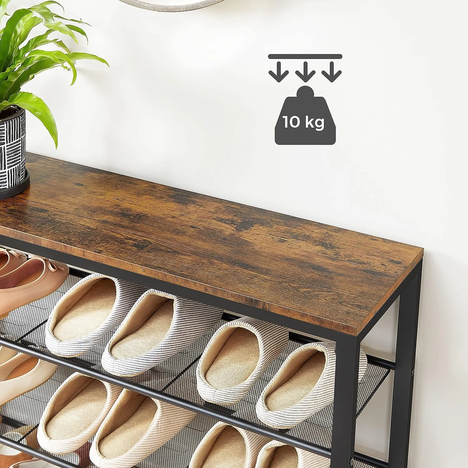 - This stylish storage shelf is designed to keep your home organized. With four open shelves featuring a dense iron mesh, you can store up to 10 kg of items on the top surface and up to 5 kg on each shoe shelf. The rustic brown finish adds a touch of charm to any room, perfect for displaying bags, keys, picture frames, and even a beautiful bouquet of roses.