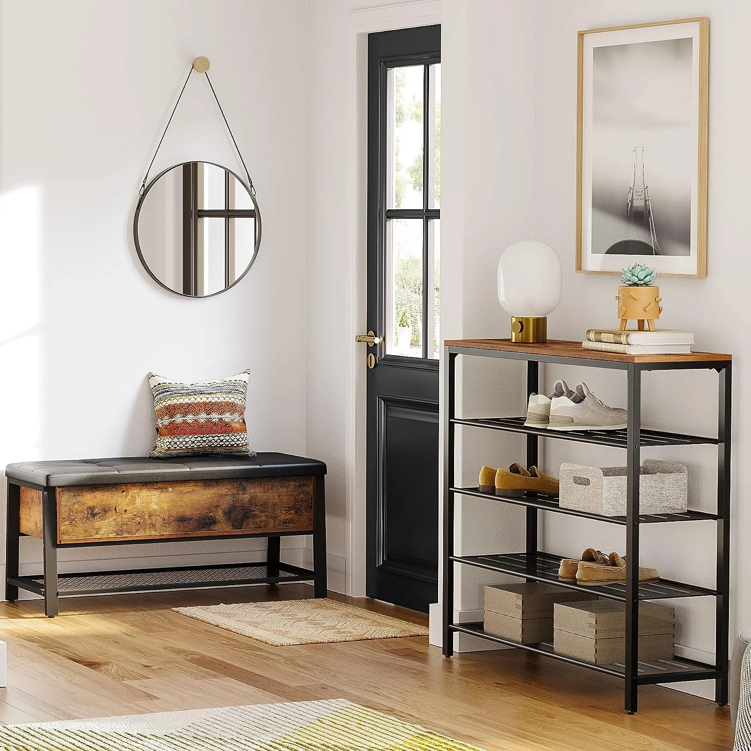 - Create a stylish and organised entrance area with this triple-bonus set. You'll receive a shelf with a smooth, engineered wood surface, a shoe rack with four black mesh shelves, and a decorative piece with an on-trend industrial look. Keep your entrance area neat and fashionable with this must-have set.