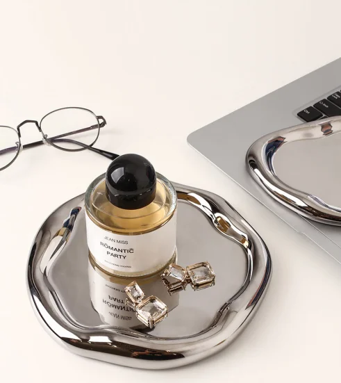 Made from premium white ceramic with a sleek, mirror-like silver-plated finish, the trays boast a glossy, reflective surface that catches light beautifully, while their organic, irregular edges add a touch of artistic sophisticationavoiding overly ornate designs in favor of the timeless, modern luxury that resonates with contemporary home styling trends. The round tray is perfect for corralling fine jewelry, watches, or perfume bottles on a vanity counter, turning everyday accessories into a curated focal point. The elongated tray, meanwhile, excels at serving petit fours or macarons at afternoon tea, or keeping desk essentials like pens and stationery neat and visually cohesive.