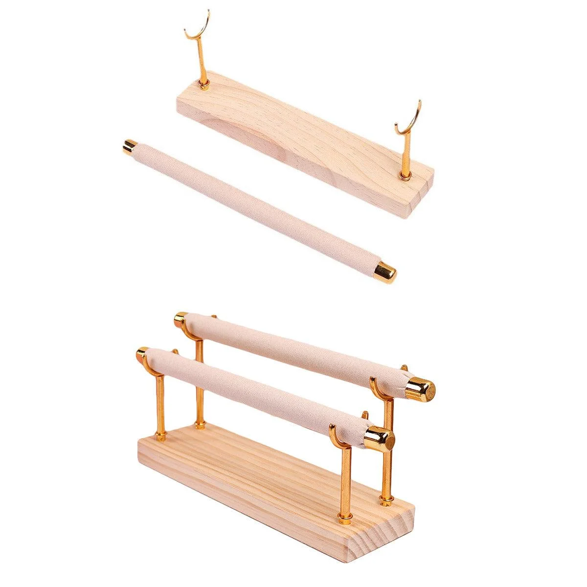 This elegant jewellery organiser is designed to help you showcase and organise your jewellery collection with style. Made from durable solid wood, the rack features velvet-covered bars that provide a soft, protective surface for your rings, bracelets, and watches. With a minimalist design and gold-tone accents, it complements any decor and suits both home and professional environments. Available in single and double-tier options, this display rack helps you efficiently store and display your favourite pieces while keeping them safe from scratches or tangling.