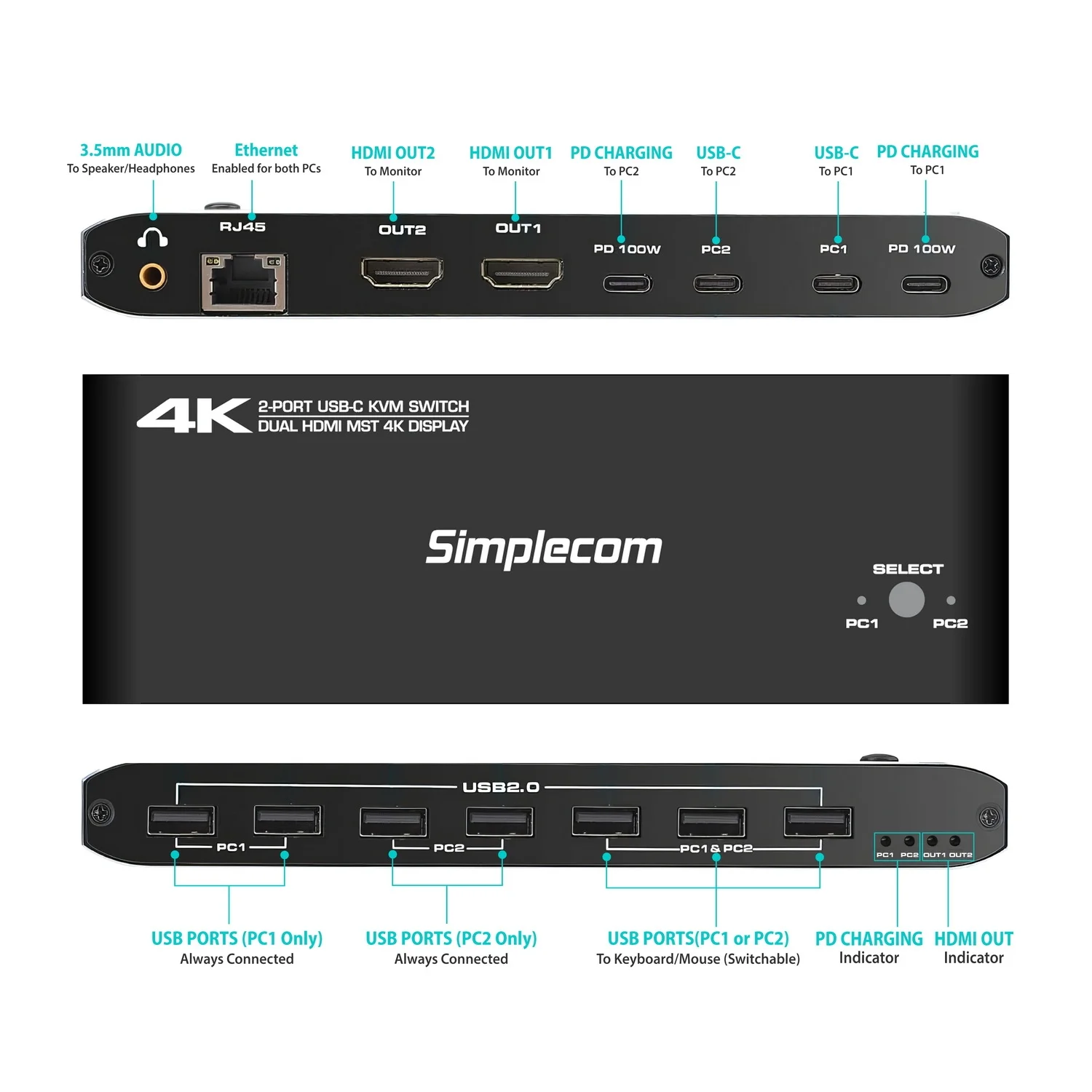 Simplecom KM590 2-Port USB-C Dual 4K HDMI Monitor KVM Switch and Docking Station with Network Sharing