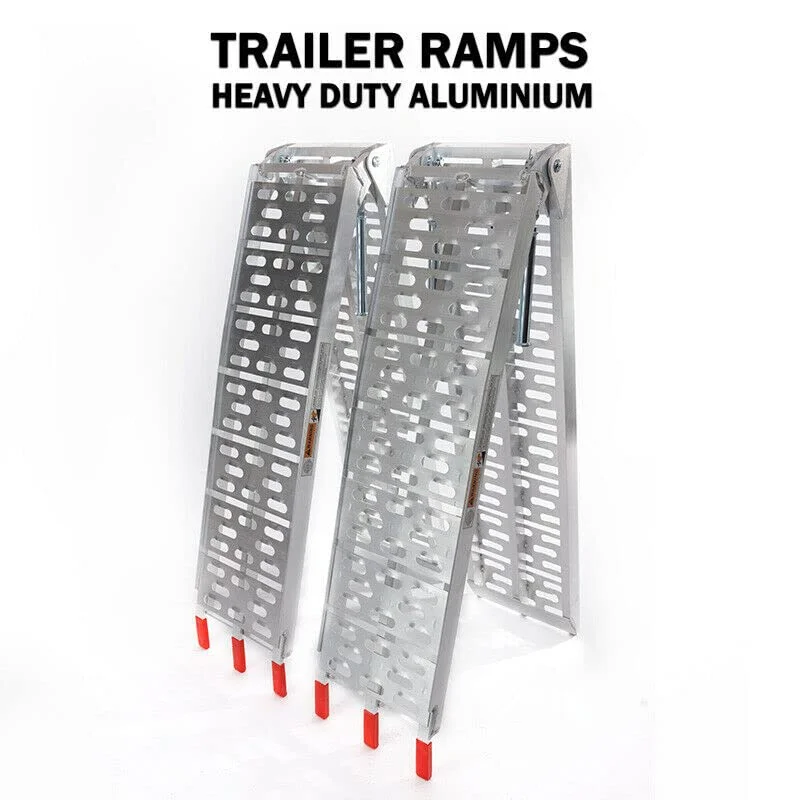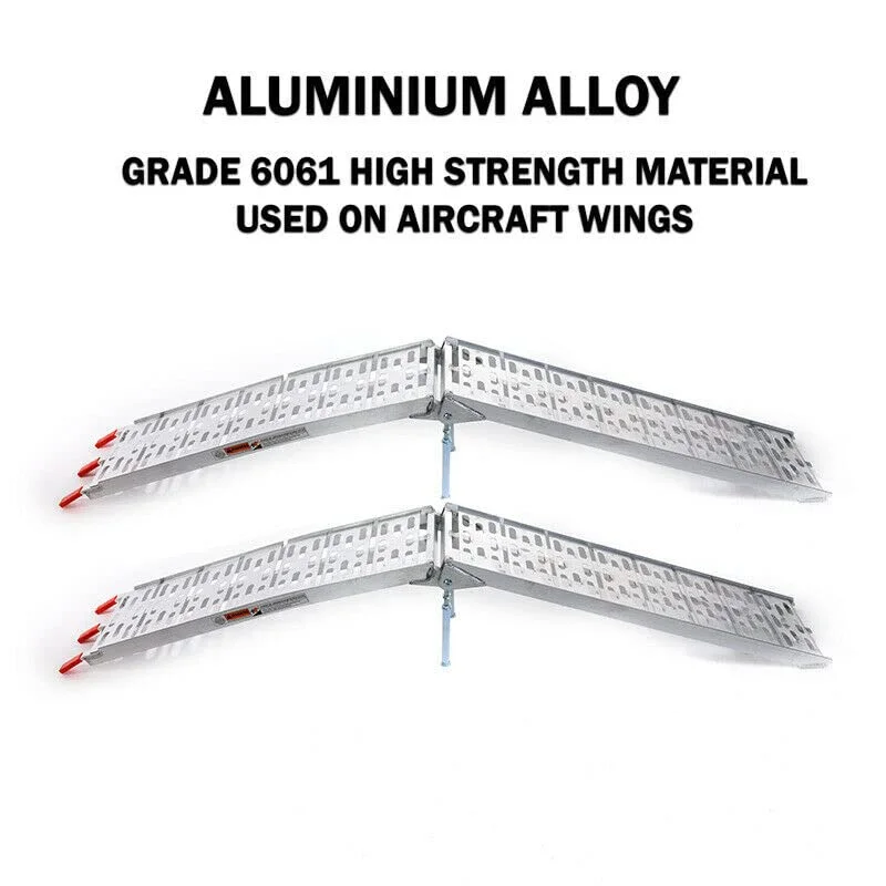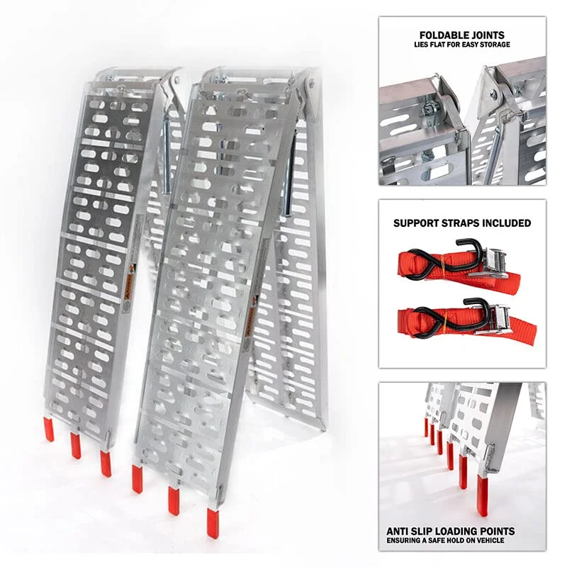 Folding aluminum ramps from Directly2U have been made with strong aluminum alloy material with support straps to ensure worry-free loading and unloading of automobiles and other things. There is an additional central beam in the ramp for bikes for bearing higher load weight.
