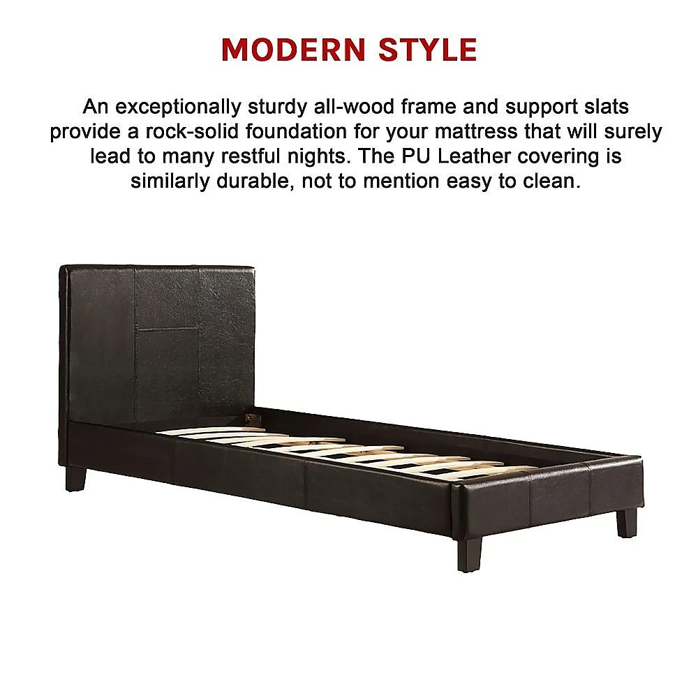 This bed from the expert craftspeople at Palermo measures 100 cm wide by 190 cm long, with a headboard that measures 88 cm tall (10cm leg 78cm headboard) from top to bottom. It fits a single mattress measuring 92 x 187 cm. The frame and headboard feature a durable PU Leather covering that's easy to clean and that will look great for many years to come. The headboard is padded for comfort while sitting up and reading or watching TV. An attractive stitched-together look and clean, simple lines make this bed frame a perfect complement to the modern bedroom. And the black colour adds visual appeal without being ostentatious.