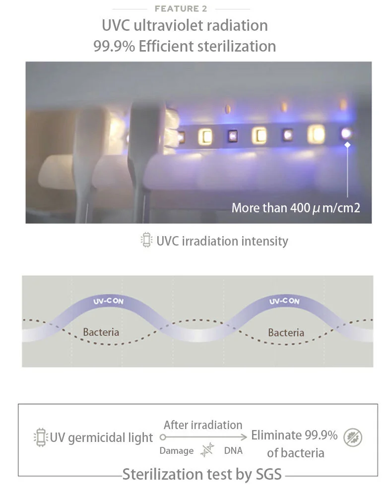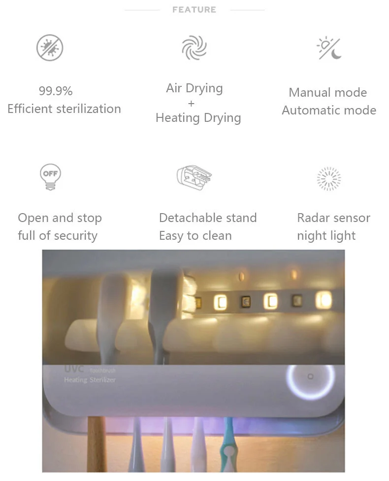 Elevate your bathroom hygiene with our Smart Toothbrush Sterilizer, designed to keep your toothbrush clean and dry every day. This all-in-one device functions as both a toothbrush storage rack and a powerful sterilizer, utilizing UVC ultraviolet radiation for 99.9% efficient sterilization, as tested by SGS. It features a 45C heat drying and air-drying function to ensure your toothbrushes are thoroughly dried. With both manual and automatic modes, you can choose a one-time cycle or have it automatically disinfect and dry at 4-hour intervals. The elegant and simple design includes a multi-card slot hanger to accommodate the whole family's toothbrushes and even a razor. For added convenience, it has a radar sensor night light that gradually illuminates as you approach. The device is easy to install with no construction required and is rechargeable via a modern Type-C port, offering long battery life with charging needed only about once a month.