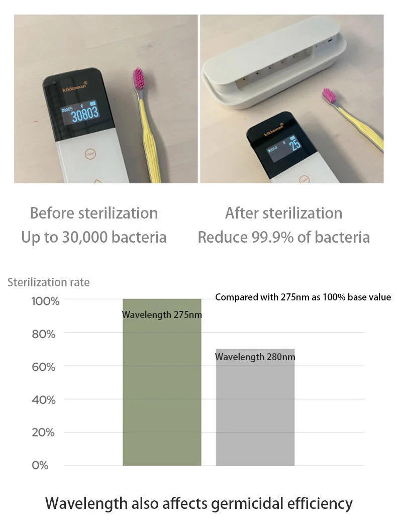 This product contains a lithium battery. Avoid direct eye exposure to the UVC light. Ensure the wall surface is clean and dry before applying the adhesive mount. Press firmly and allow the adhesive to set for 24 hours before hanging the main unit. Toothbrushes and razor shown in images are for illustrative purposes only and are not included. Clean the detachable bracket regularly to maintain hygiene. The sterilization rate is based on laboratory tests; actual performance may vary slightly.