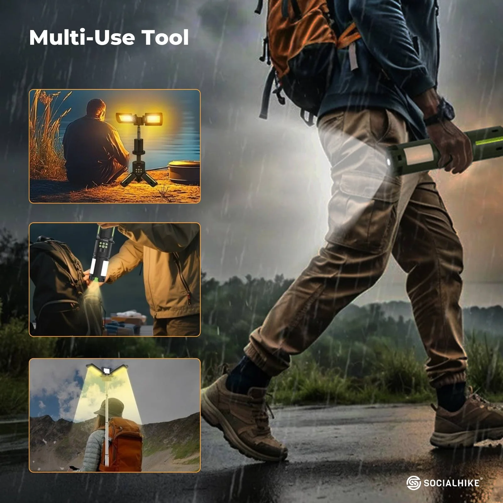 Social Hike Rechargeable Outdoor Camping Light is a foldable, telescopic lantern and power bank in one. Dual light modes, adjustable brightness, and RGB plus SOS warning lights make it ideal for camping and emergency use. Powered by a 10,050 mAh lithium-ion battery pack, it delivers up to 80 hours of light or 20W USB-C fast charging for small devices. Made from durable PC, ABS, and aluminium alloy with IPX6 water resistance and a magnetic tripod-ready base, this portable light is compact and reliable.
