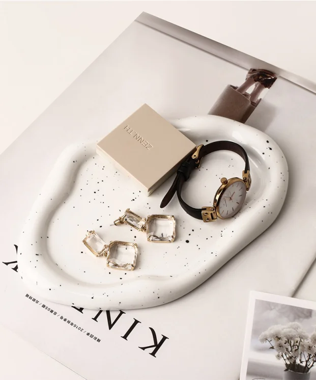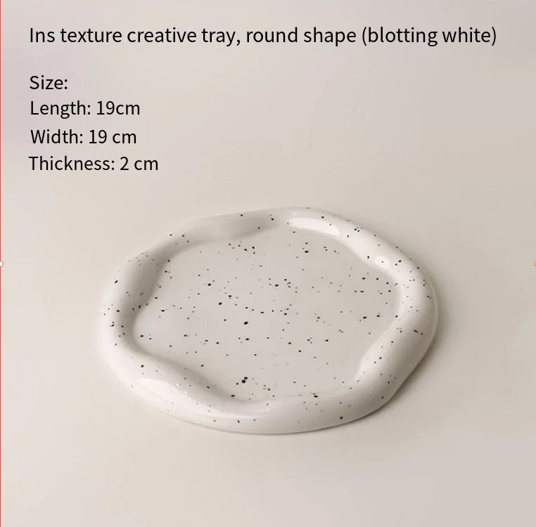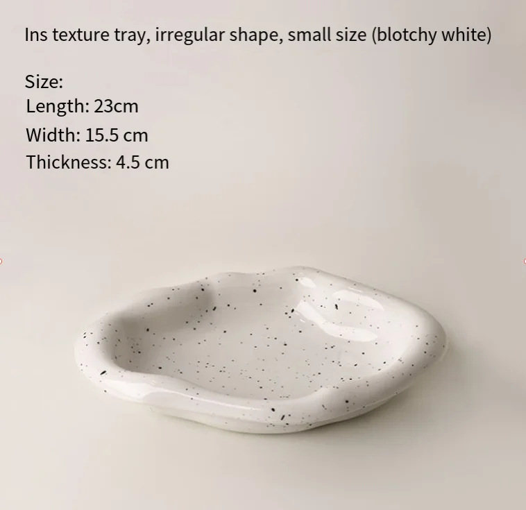 Made from premium white ceramic with a chic black speckle finish, each tray features organic, irregular edges that add an artistic touchavoiding rigid lines for a relaxed, curated vibe. The round tray is perfect for corralling necklaces and rings on a vanity; the long tray excels at serving berries or holding desk essentials; the irregular tray doubles as a fruit dish or a display for small decor pieces.
