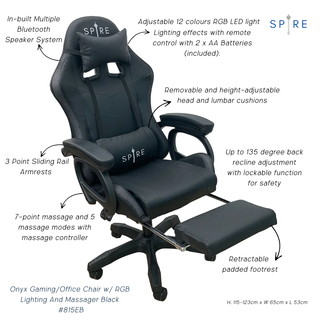 Crafted with comfort and style in mind, our Spire ONYX Gaming Chairs feature 12 colours of LED lights, multiple Bluetooth speaker functionality and 7 massage points making the gaming experience more comfortable and enjoyable.