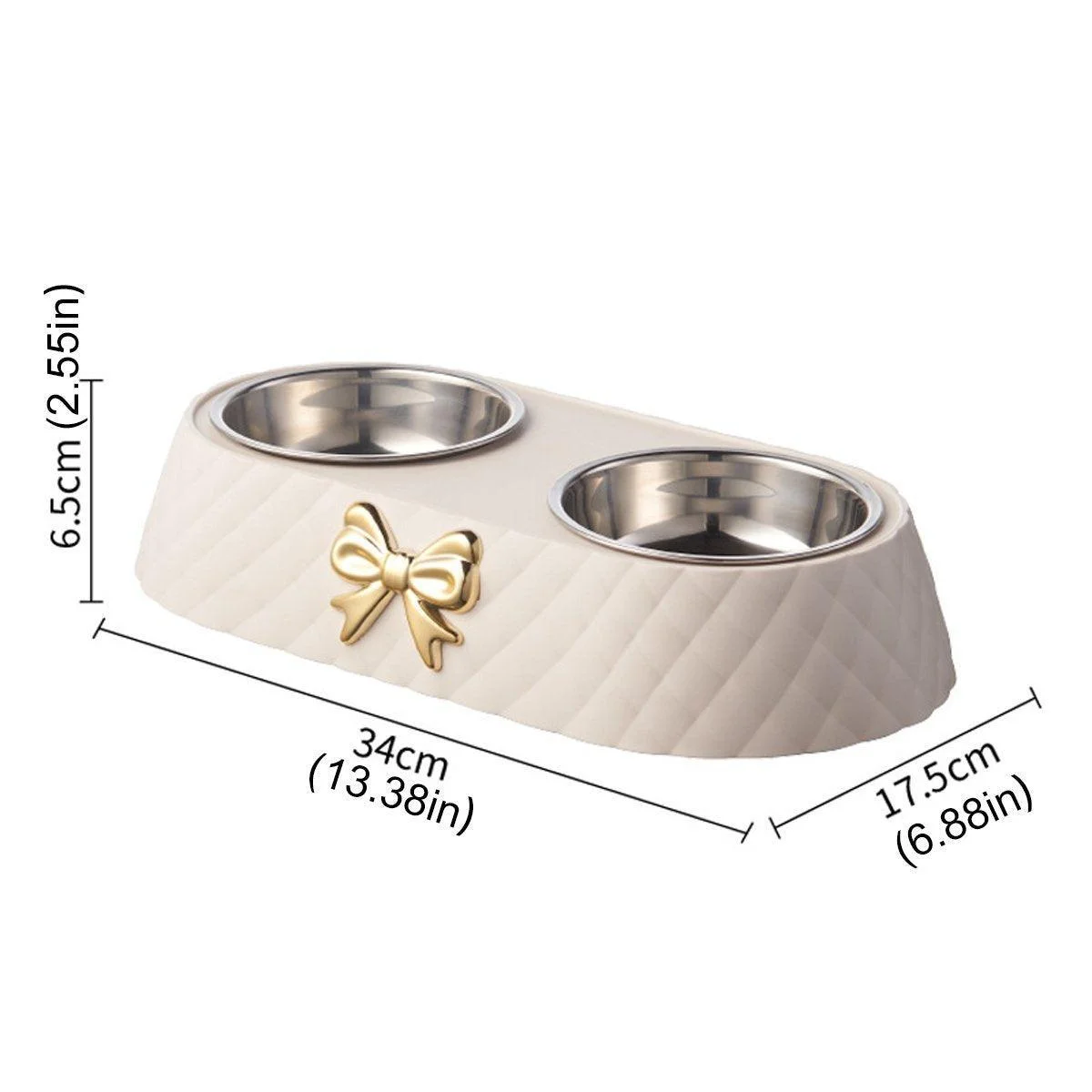Enhance your pet's dining experience with this stylish stainless steel double bowl feeder. Crafted with high-quality stainless steel, these bowls are durable, rust-resistant, and easy to clean. The elegant base, adorned with a charming bow accent, adds a touch of sophistication to any home decor. The non-slip, anti-knock design ensures stability, preventing spills and reducing noise during feeding time. This double bowl setup provides separate spaces for food and water, making it a convenient and efficient choice for both cats and small dogs.