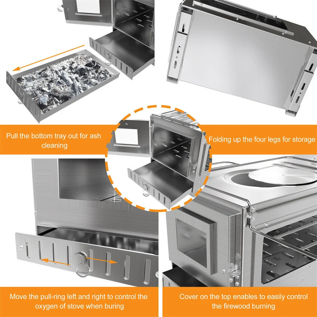 Stainless Steel Wood Burner Stove for Camping w/ Chimney & Bag