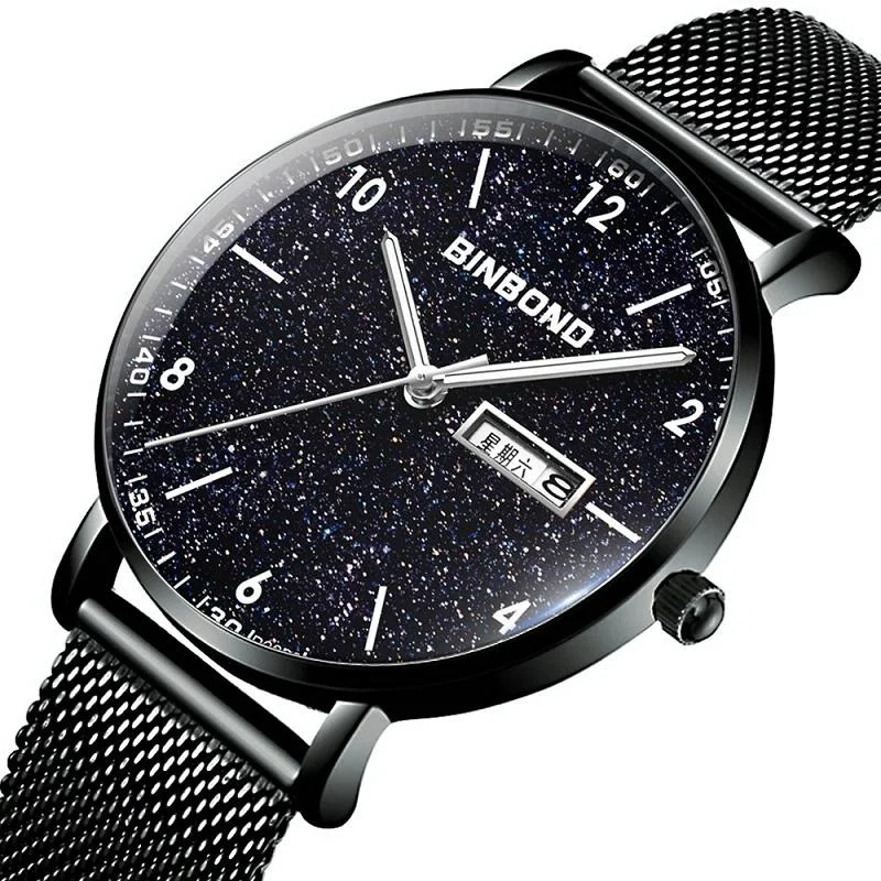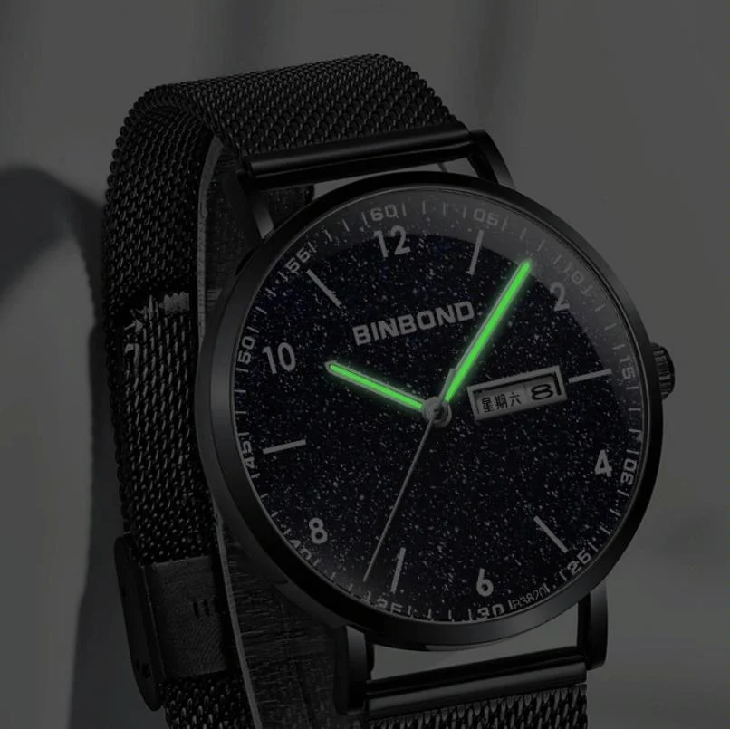 Waterproof Luminous Men Quartz Watch - Hollow Design - Black Leather White Steel Black Surface