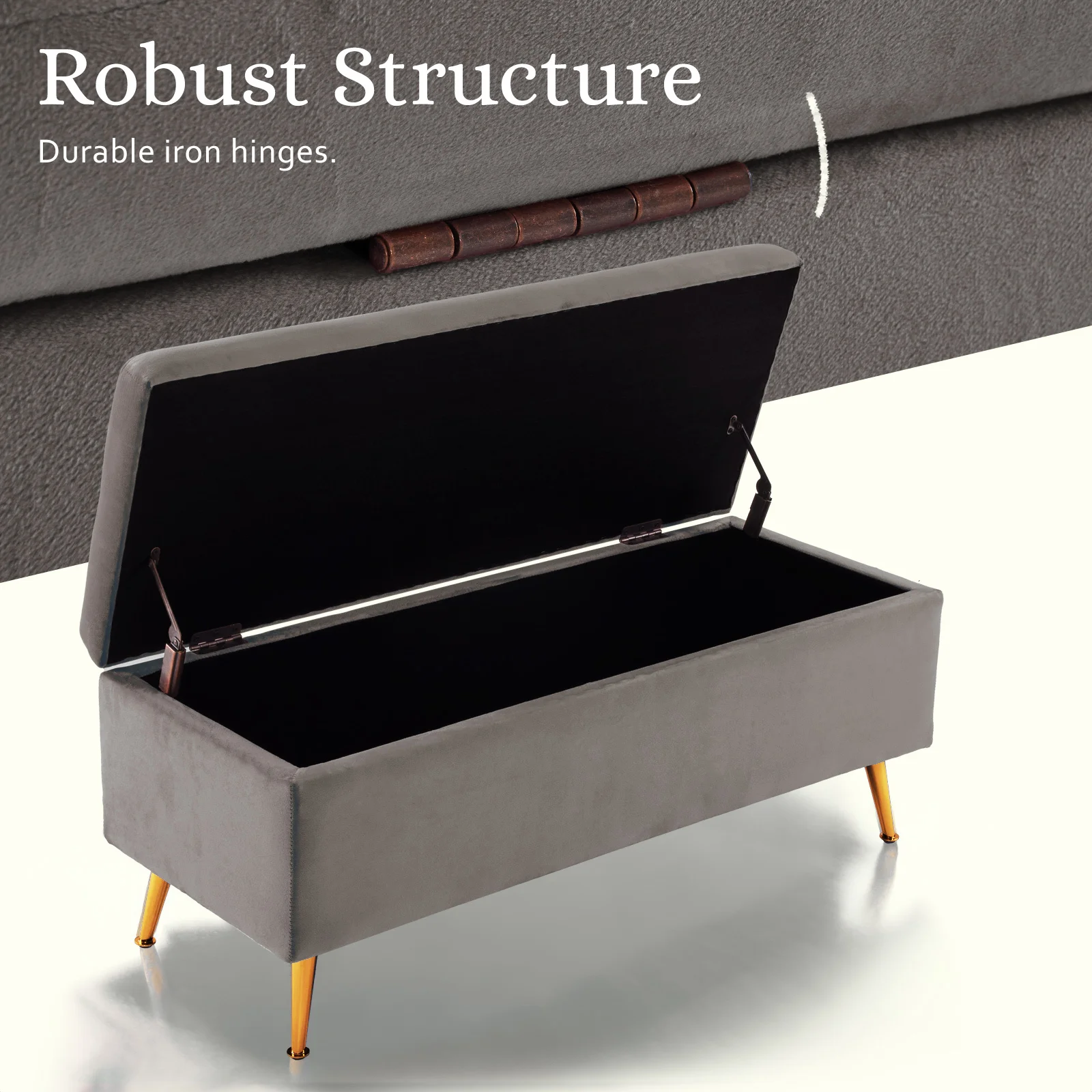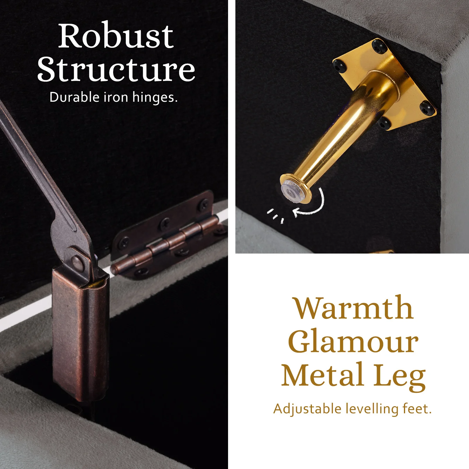 With sleek metal legs for stability, lift the lid to find a roomy interior - ideal for storing blankets and pillows discreetly. This Ottoman Storage is more than practical; it's versatile, serving as a comfy footrest or extra seating for guests.