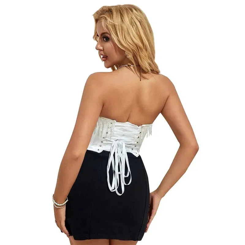 Vintage Floral Crop Top With Puff Sleeves Black / Pink / Green Denim Jeans Fabric Zip Up Corset For Women - Black - Xl