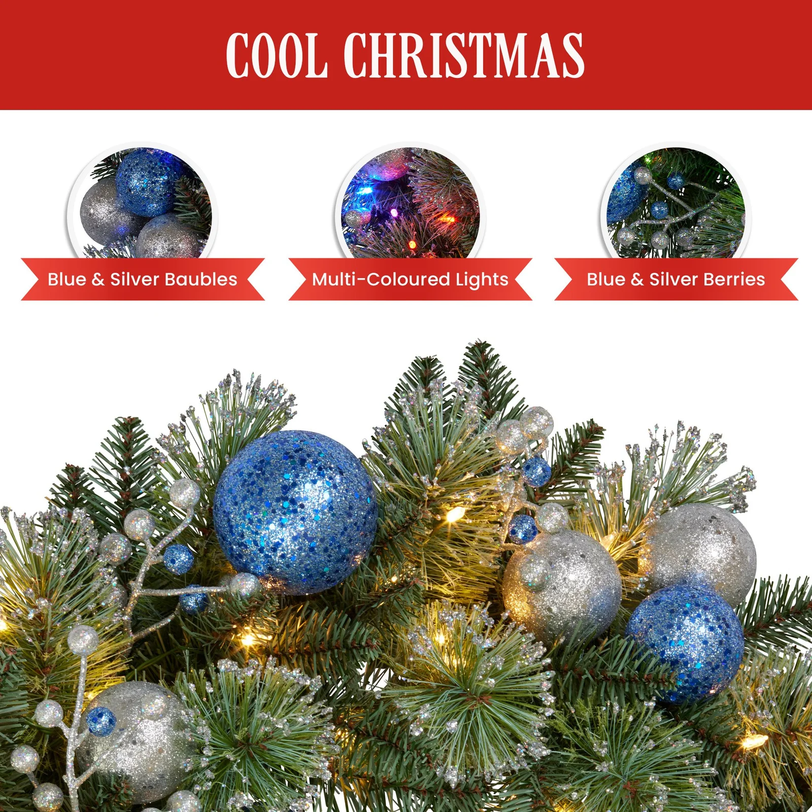- Silver and blue baubles and berries