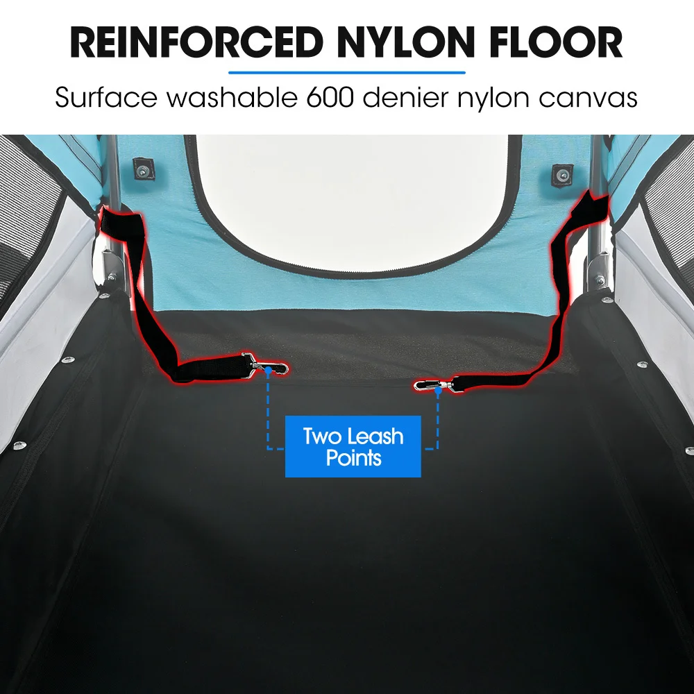 Your dog will enjoy a smooth, comfortable ride in the Tag-Along trailer. The spacious 267-litre cabin is covered in durable 600D nylon canvas with secure hook and loop fasteners that create a secure and comfortable passenger compartment for your best friend. The shell is rainproof to protect your furbaby from the elements.The cover features zip-up all-weather clear vinyl windows and sun-screening mosquito mesh. The floor padding is also covered in nylon canvas for easy care. It is removable, washable and offers your dog plenty of room to relax while you explore together.