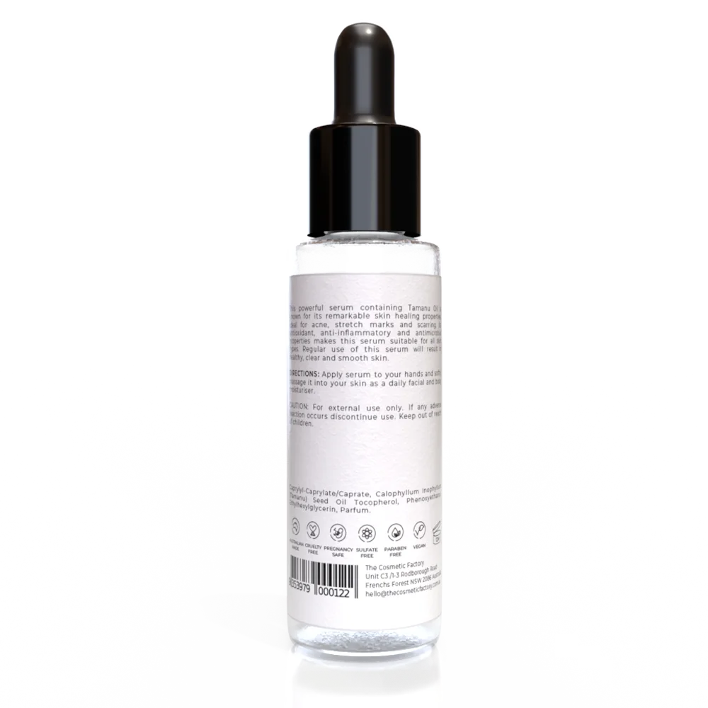 ABOUT: This powerful serum containing Tamanu Oil is known for its remarkable skin healing properties, ideal for acne, stretch marks and scarring. Its antioxidant, anti-inflammatory and antimicrobial properties makes this serum suitable for all skin types. Regular use of this serum will result in healthy, clear and smooth skin. RECOMMENDED FOR: All skin types, including acne prone.