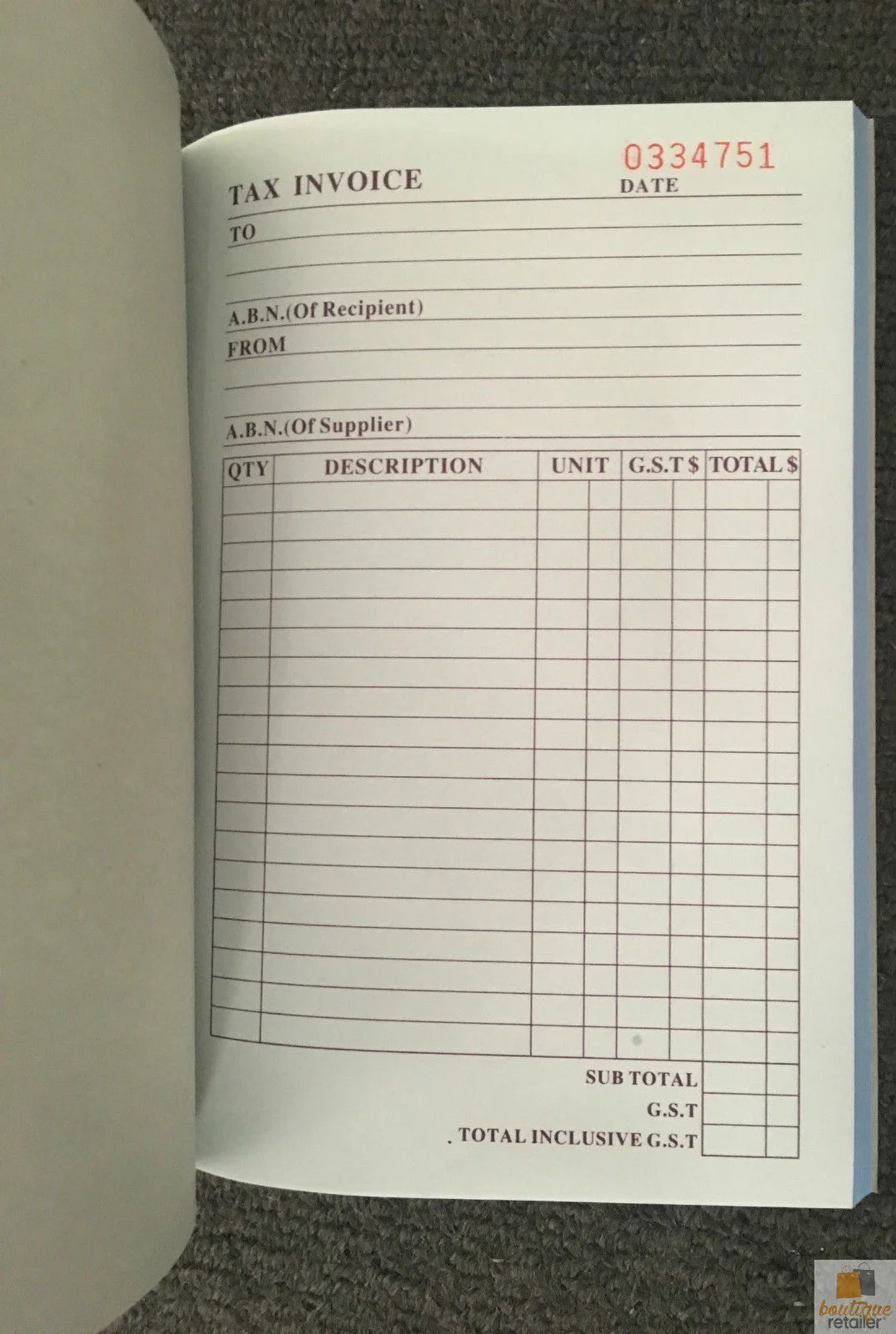 Includes: - GST section - ABN Details - 50 uniquely numbered duplicate pages (carbonless)