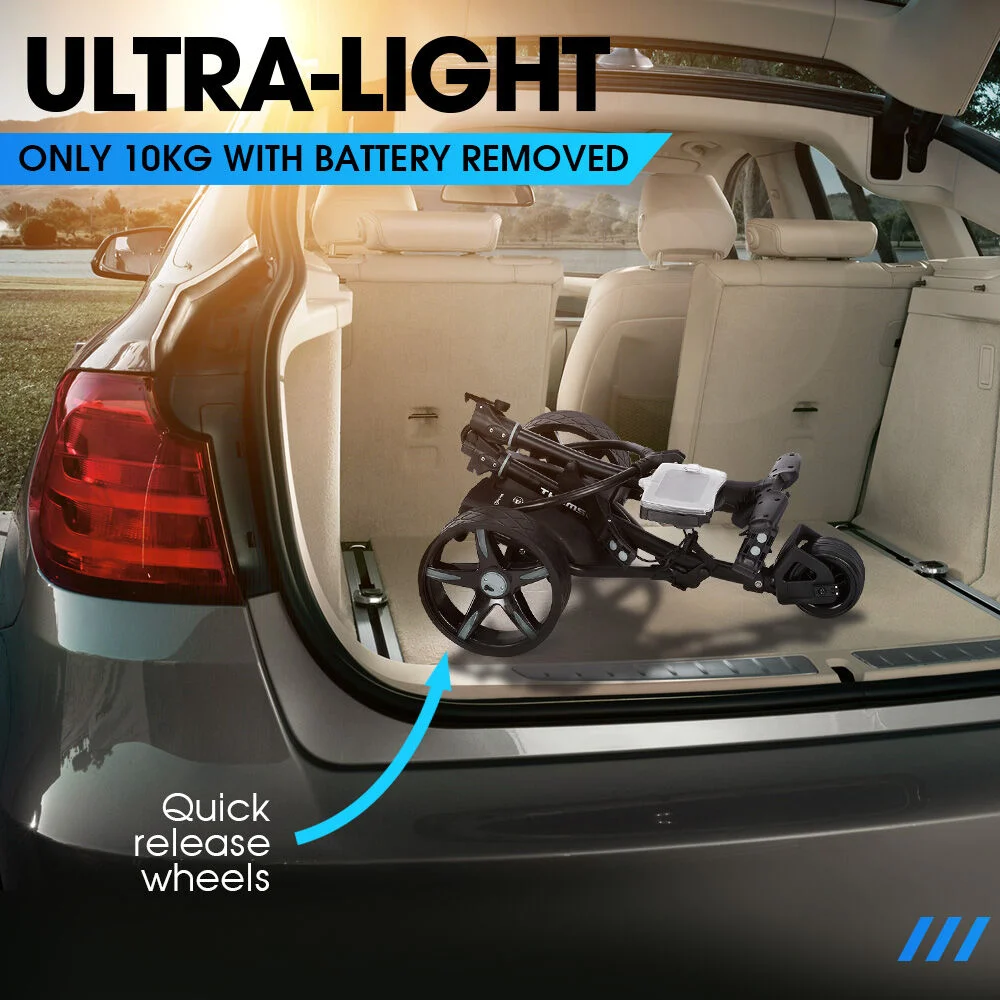 The advanced electric motor powers through any terrain, handling inclines up to 30 degrees with ease, so you can walk the course without fatigue. Designed for ultimate convenience, the lightweight 10kg aluminium frame folds in just 2 seconds to an ultra compact, making transport and storage hassle-free. The 9-speed control dial (up to 8km/h) ensures the buggy keeps pace with you and Auto Distance Function (with 10m, 20m, 30m presets) allows you to send the buggy ahead.