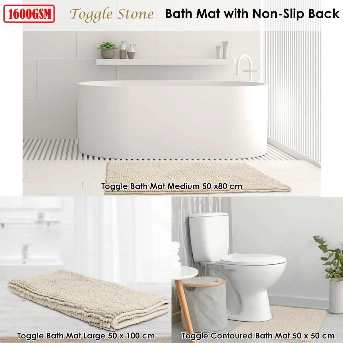 This luxurious 1600GSM Toggle Microfiber Bath Mat with Non-Slip Back Stone is fast drying, absorbent and features non-slip backing. Featuring an applique design in soft neutral tone that will add a decorative touch to any bathroom. It is made from quality and easy care microfiber fabric.
